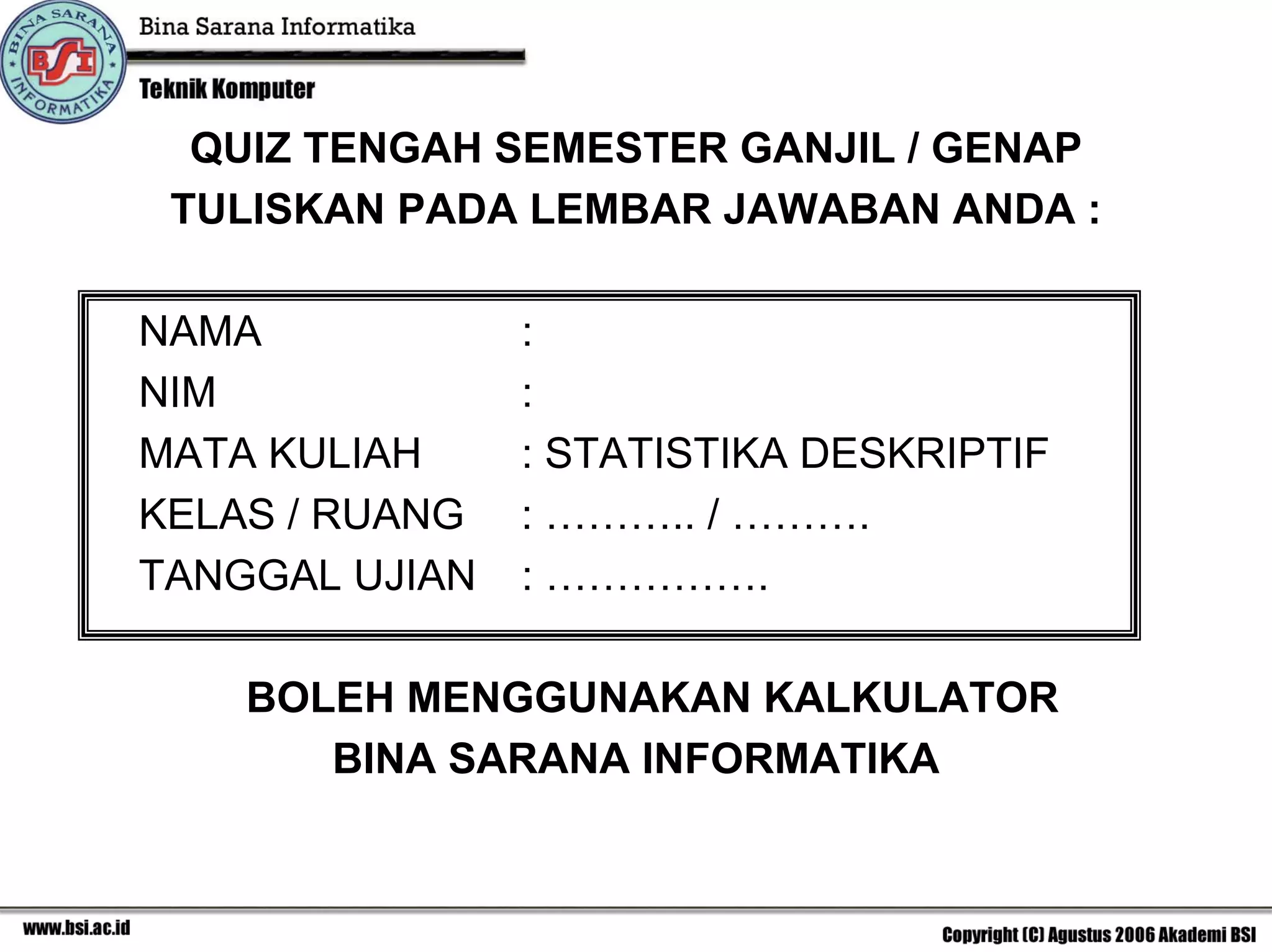 Dokumen ini adalah soal quiz untuk mata kuliah statistika deskriptif yang mencakup berbagai topik seperti pengolahan data, perhitungan statistika deskriptif, serta analisis deret waktu. Terdapat berbagai pertanyaan pilihan ganda yang mengharuskan mahasiswa untuk menggunakan kalkulator dalam menyelesaikannya. Isinya juga mencakup cara menghitung nilai rata-rata, median, modus, dan variasi, serta pengenalan metode peramalan dan indeks harga.