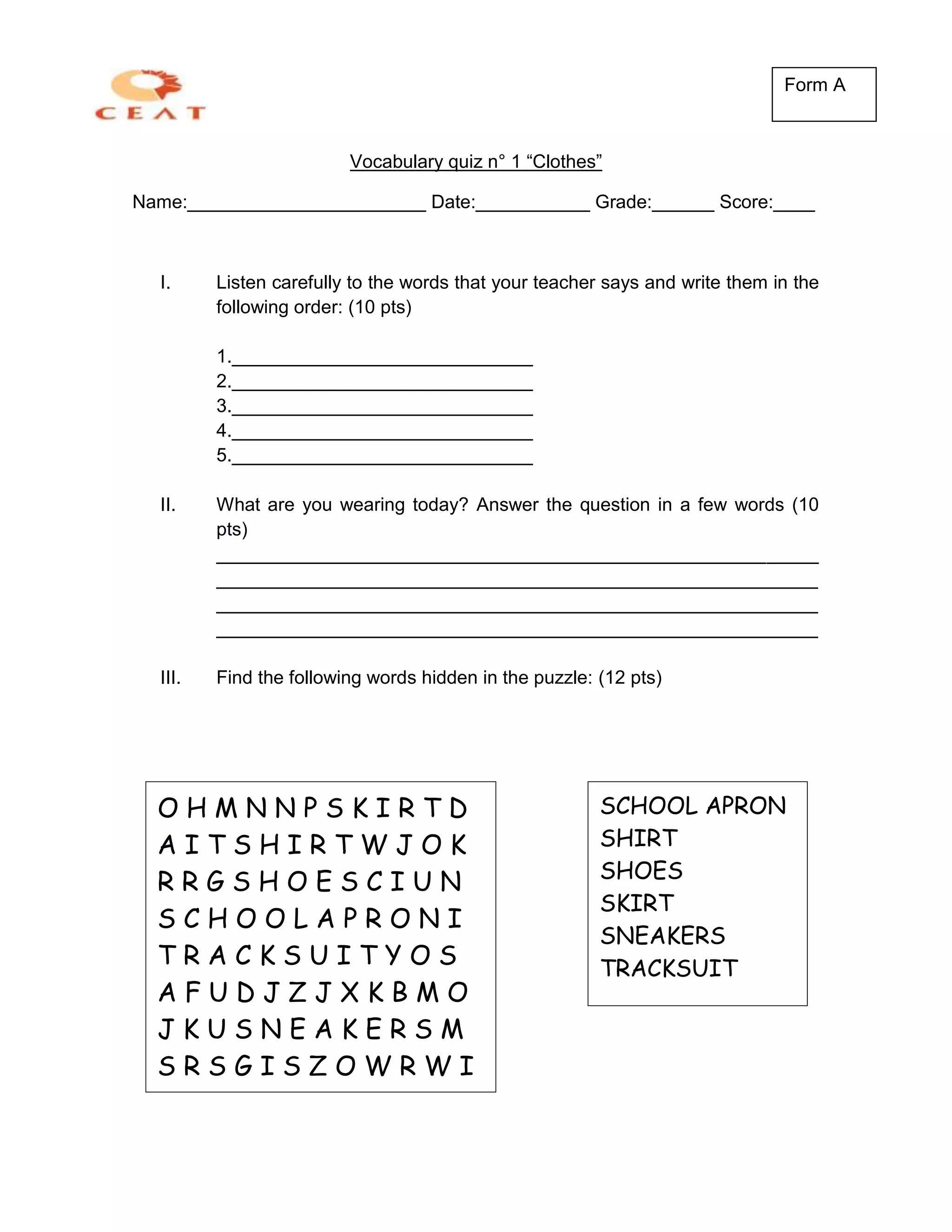 This document is a vocabulary quiz about clothes that tests students' abilities to listen for and write down words related to clothing, describe what they are wearing that day in a few words, and find hidden clothing-related words in a word puzzle. It contains sections where students must listen and write clothing words, answer a question about what they are wearing, and find hidden words in a puzzle grid. The quiz tests vocabulary related to common clothing items and is graded on completion.