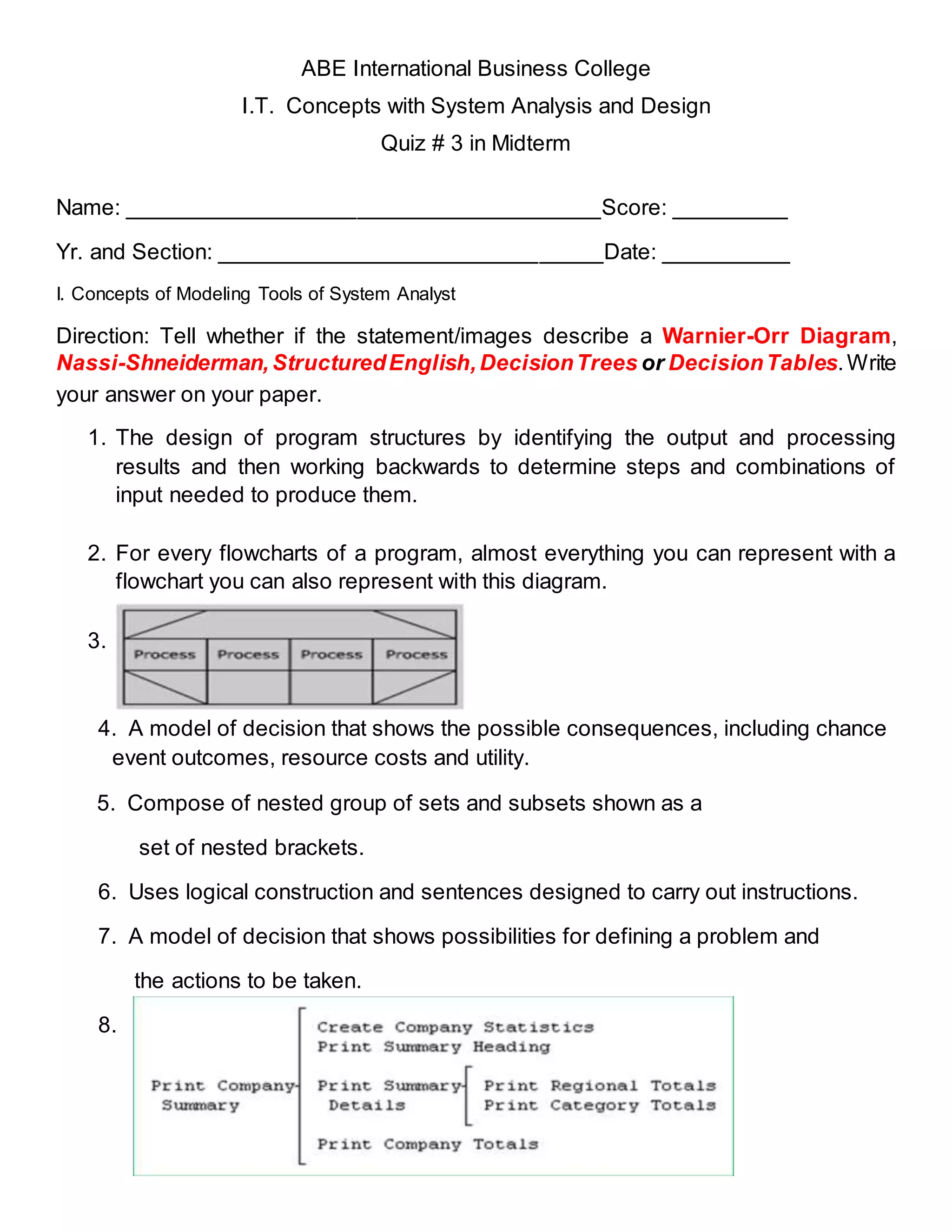 1. The document is a quiz from ABE International Business College assessing concepts of modeling tools used in system analysis and design.