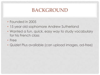 Quizlet is a free online flashcard tool that was created in 2005 by high school student Andrew Sutherland to help him study for his French class. It allows users to create digital flashcards across many subject areas and share them with others. Teachers commonly use Quizlet to provide study materials for students and assign practice quizzes. The site has over 1.3 million registered users who have created more than 3.5 million flashcard sets covering a wide range of academic topics.
