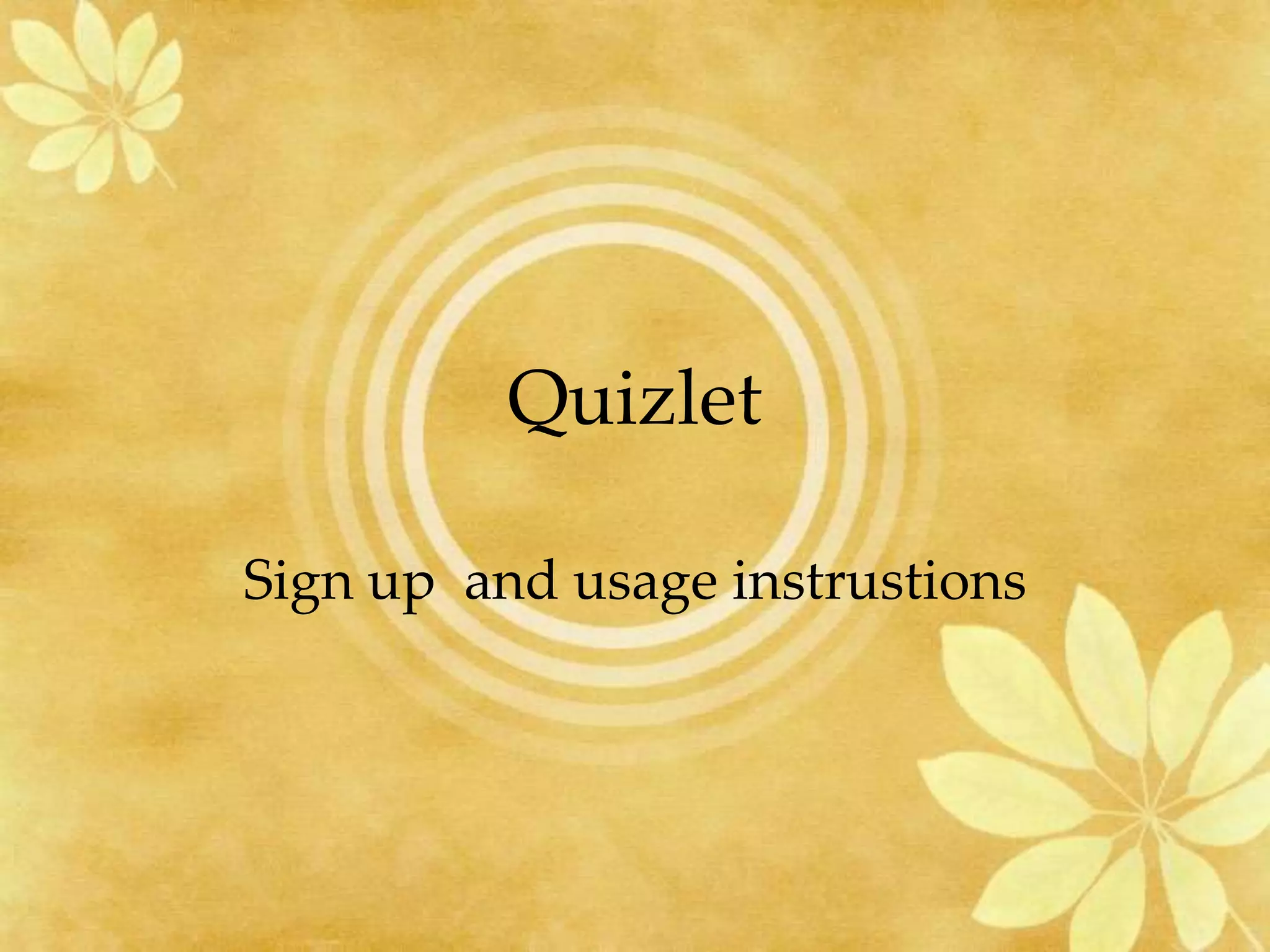 This document provides instructions for signing up and using the study site Quizlet. It explains that students can join groups made by their teacher to access flashcard sets for different classes, and can also make their own flashcard sets. It lists the website address and provides steps for signing up, activating an account, searching for and joining groups, and studying flashcards or playing games on Quizlet.