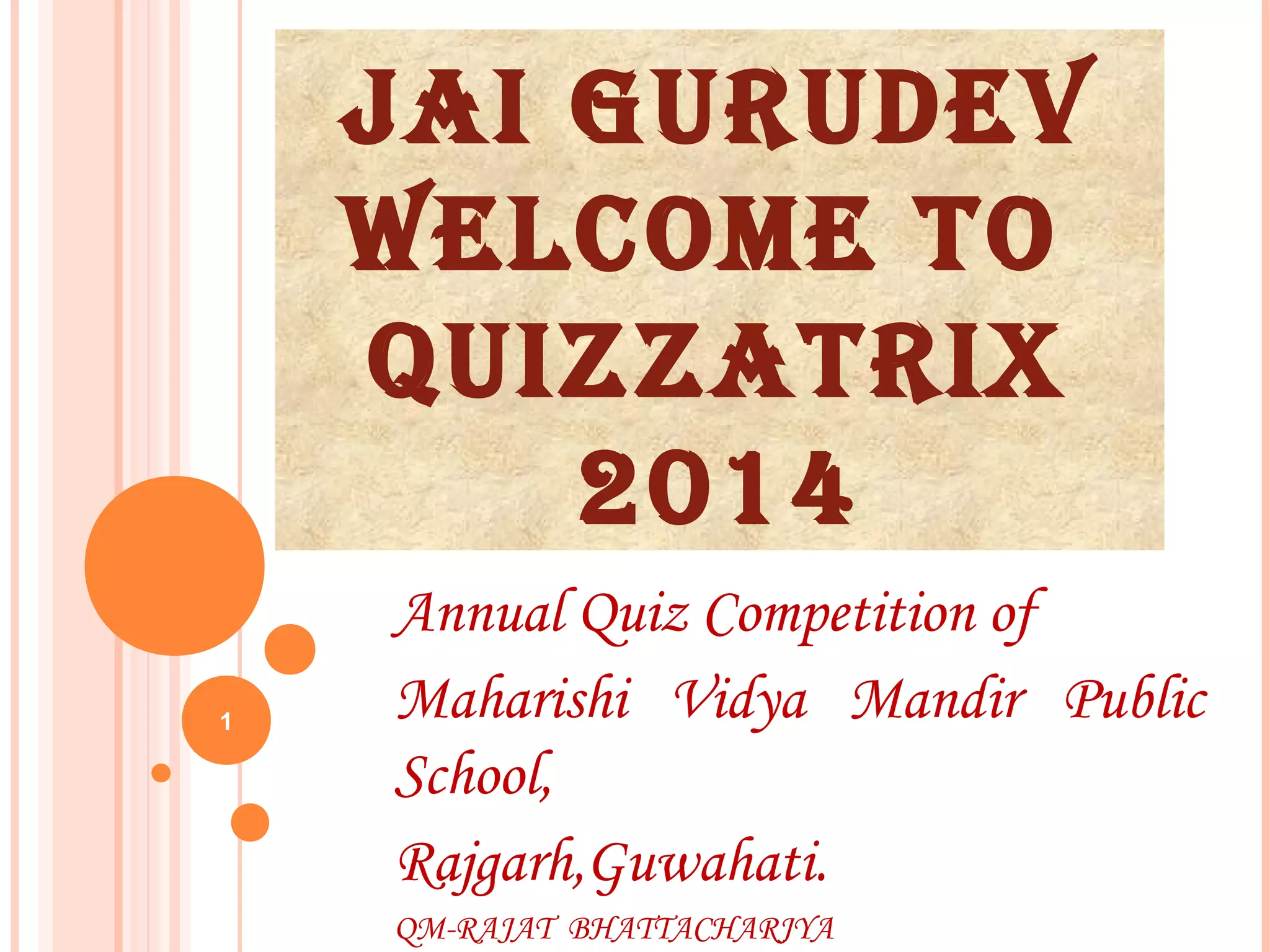 The document provides rules for an annual quiz competition held by Maharishi Vidya Mandir Public School in Guwahati. It outlines 5 rounds of questions with varying point values for correct and incorrect answers. Direct questions are worth 10 points, pass questions 10 points, pounce questions 10 points for correct answers and -10 for incorrect answers. Bonus questions at the end of each round are worth 20 points for a correct answer and -15 for an incorrect answer. The quizmaster's decision is final.
