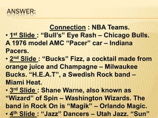 This document contains the rules for a trivia game called "Quizzics" and examples of trivia questions and answers related to various topics. The rules state there are no actual rules except the moderator's rules, and answers should be followed by specific images or details. Sample questions include identifying the location of CERN, unscrambling people involved with the Rubik's Cube, and connecting fictional characters to real people, places or events related to topics like the NBA or Trojan War. The document aims to entertain readers with an interactive trivia experience.