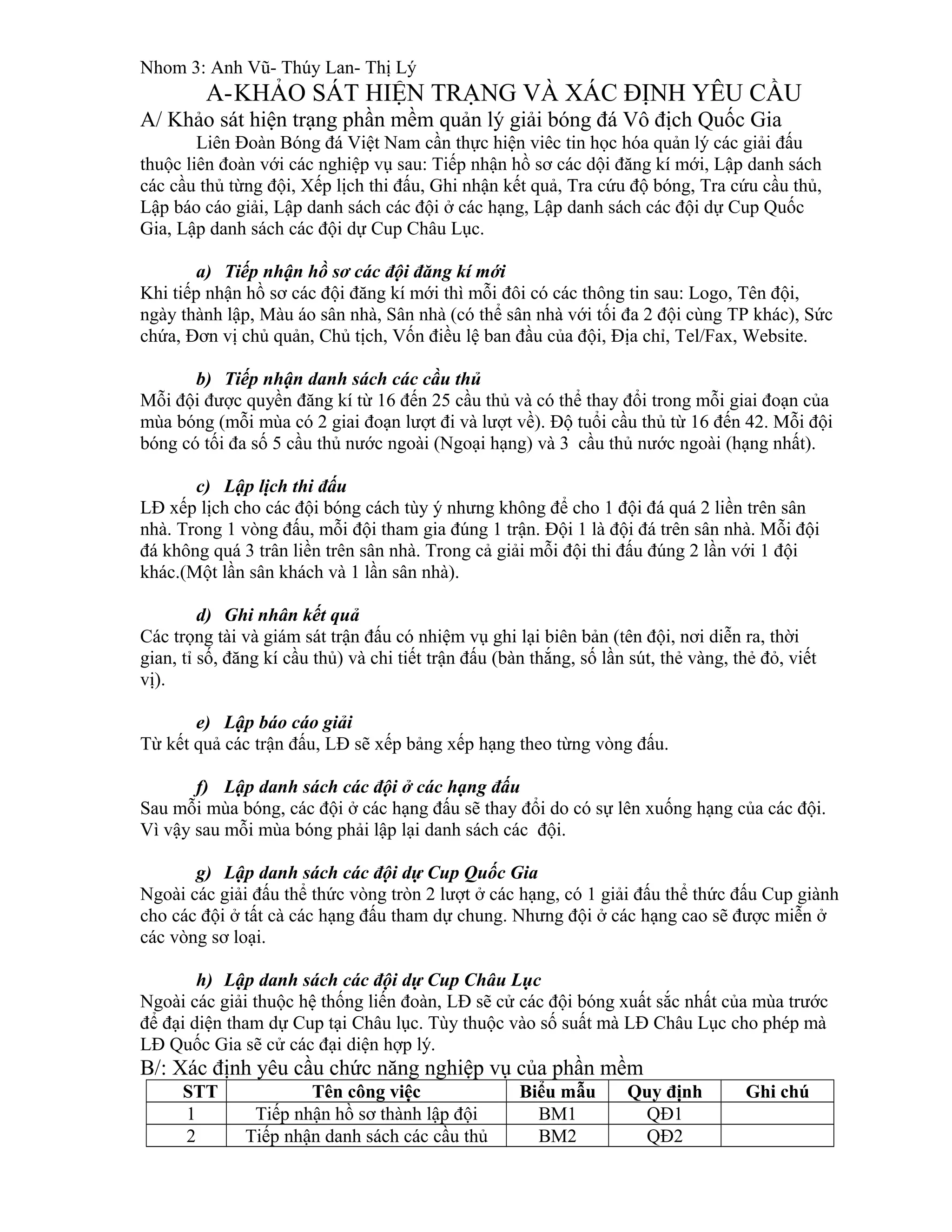Tài liệu mô tả quy trình và yêu cầu chức năng cho phần mềm quản lý giải bóng đá vô địch quốc gia Việt Nam, bao gồm việc tiếp nhận hồ sơ đội bóng, danh sách cầu thủ, lập lịch thi đấu, ghi nhận kết quả và lập báo cáo giải. Nó cung cấp chi tiết về các quy định liên quan đến việc thành lập đội bóng, danh sách cầu thủ, lịch thi đấu và các tiêu chí để tham gia các giải đấu quốc gia và châu lục. Các yêu cầu được phân loại thành nhiều biểu mẫu khác nhau để quản lý thông tin hiệu quả.