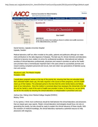 The document contains responses from three medical professionals on how to increase visibility and importance of clinical laboratories. Daniel Garwicz from Sweden emphasizes the importance of professional excellence and societies promoting competent laboratory staff. Moushumi Lodh from India suggests prioritizing pregnant women's education on laboratory tests to benefit their and their families' long-term health. Jianhua Han from China recommends more case-based conferences between laboratories and physicians to help laboratories better explain test results and their clinical relevance for diagnosis.