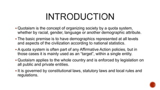 The document discusses quotaism and reservation systems in India. It provides background on reservation policies based on caste, religion, gender, and economic status. It outlines the constitutional basis for reservations in Articles 14, 15, 16, and 46. Both benefits and criticisms of the reservation system are mentioned, including that it helps socially backward groups but can also divide people and lower standards. The document concludes by suggesting reservations be provided through monetary support rather than quotas to not compromise on merit.