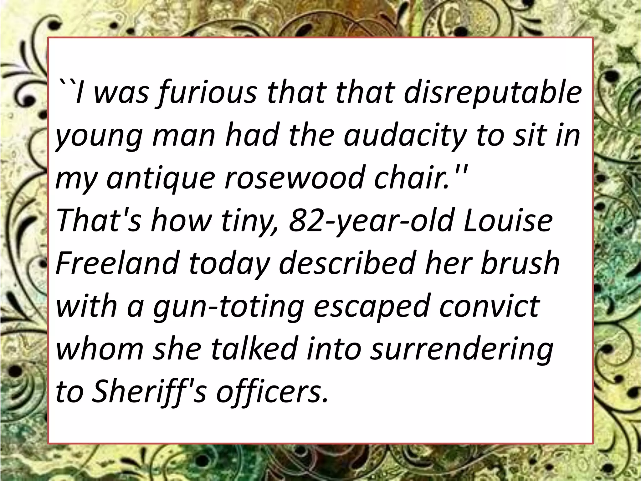 The document contains four short paragraphs about an 82-year-old woman who confronted an escaped convict sitting in her chair, a juvenile court judge who wants to hold parents accountable for rising juvenile crime rates, the ironic words on the door of a student who killed another student, and a woman who is no longer laughing about the "mother's curse" her own mother gave her now that she has children of her own who act like she did.