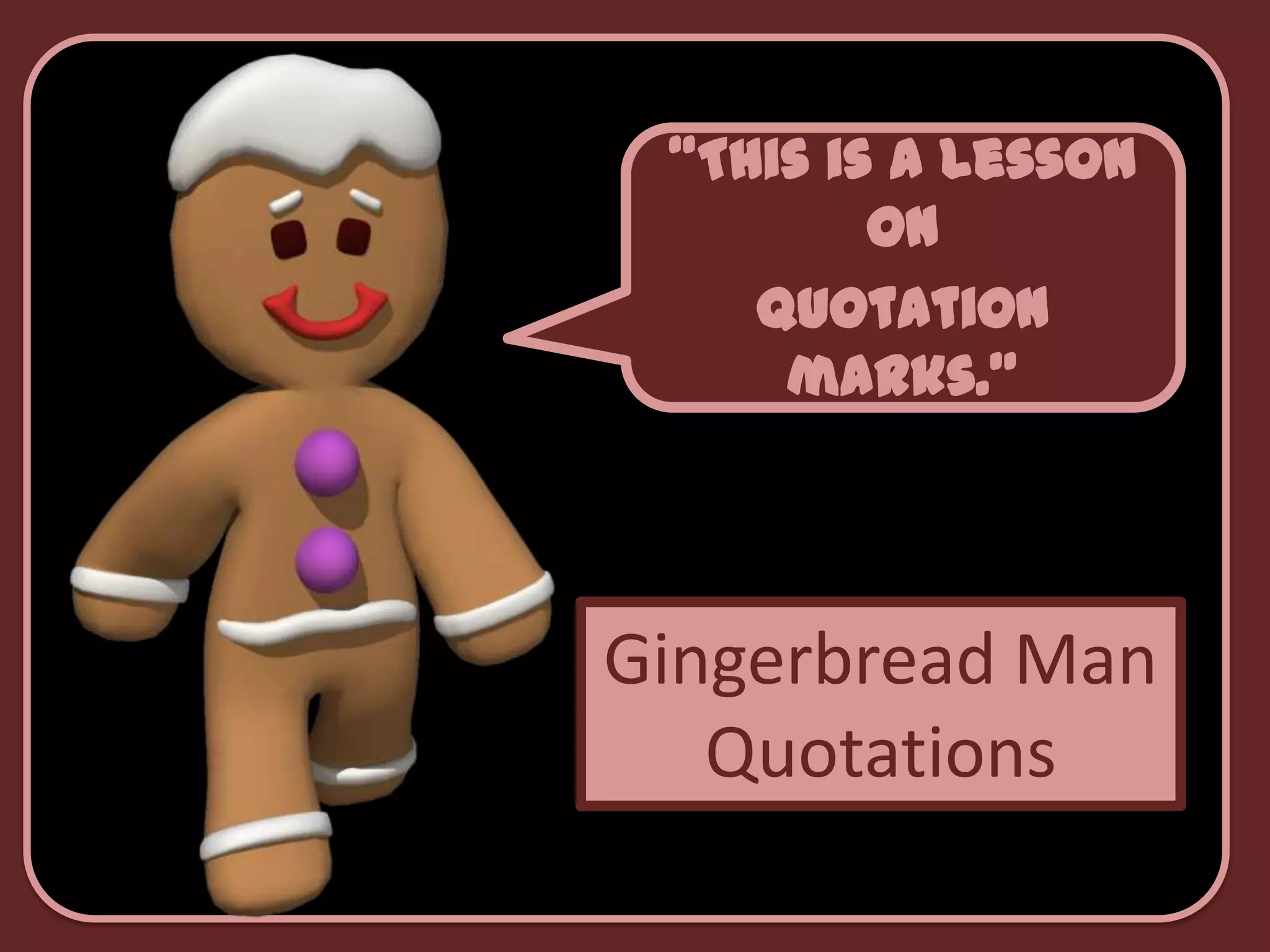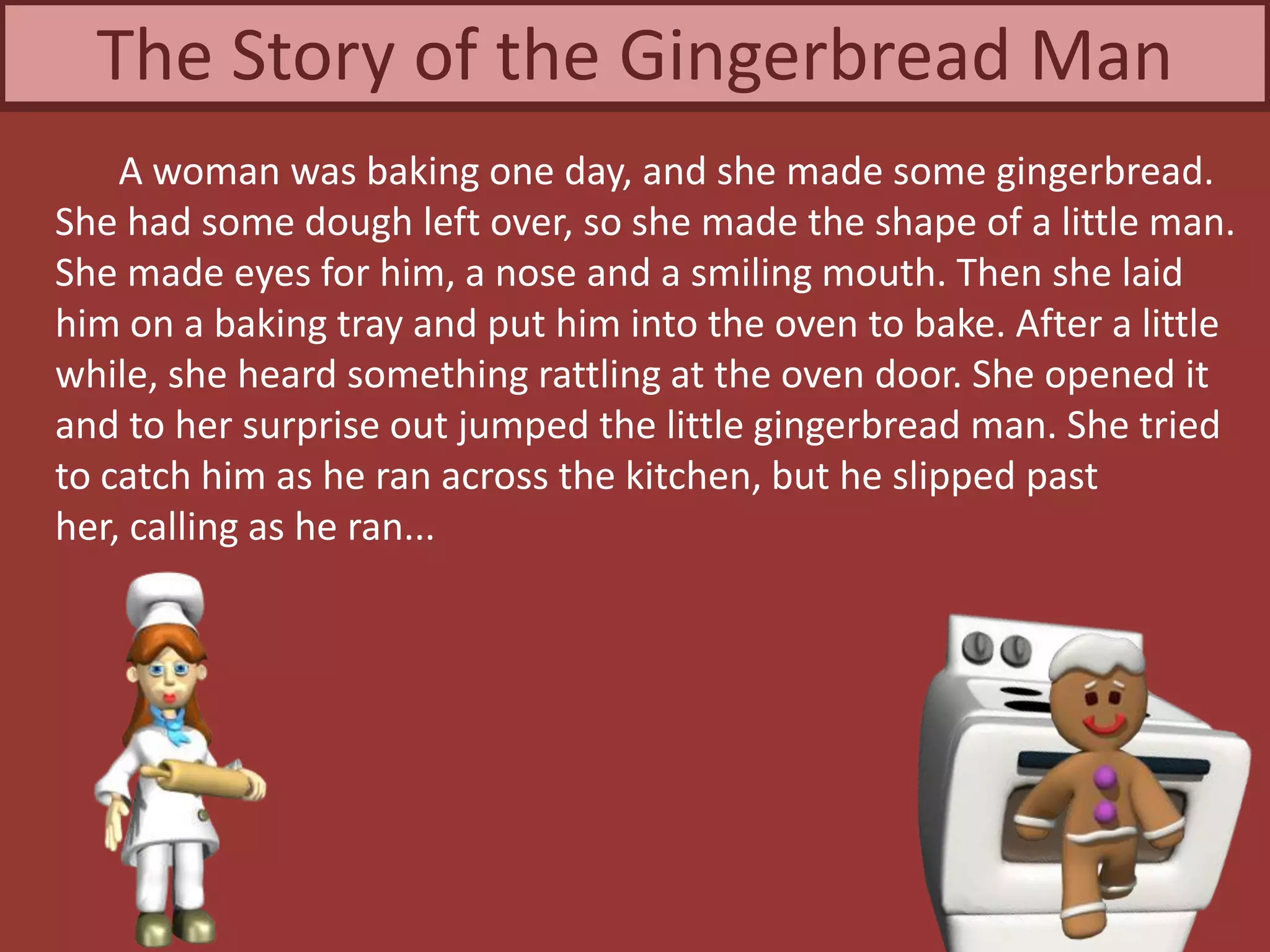The gingerbread man comes to life after being baked and escapes from the woman who made him. He taunts various animals and people who try to catch him as he runs away, saying "Run, run as fast as you can, you can't catch me, I'm the gingerbread man!". Eventually he comes to a river and tricks the gingerbread man onto his back to carry him across, but eats him when they reach the other side. The story teaches about using quotation marks correctly to identify direct quotes.