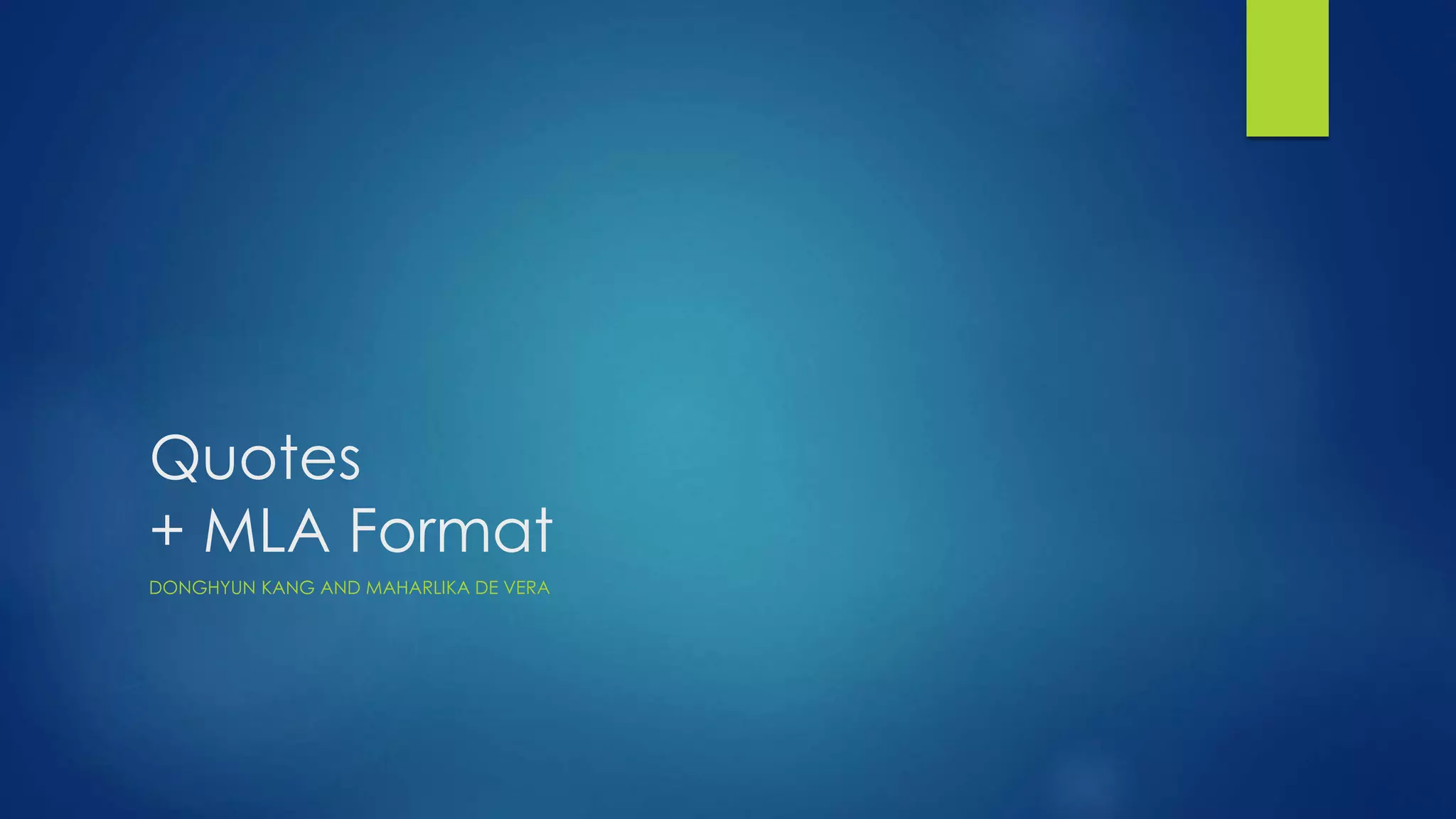 This document provides guidelines for formatting a paper according to MLA style. It discusses general guidelines like double spacing, font size, and margins. It also covers specific MLA formatting for things like the header, heading, quotes, and citations. Examples are provided for short quotes, long quotes, poetry quotes, and setting up a works cited page. The document also briefly compares MLA style to APA style and includes a mini quiz to test understanding.