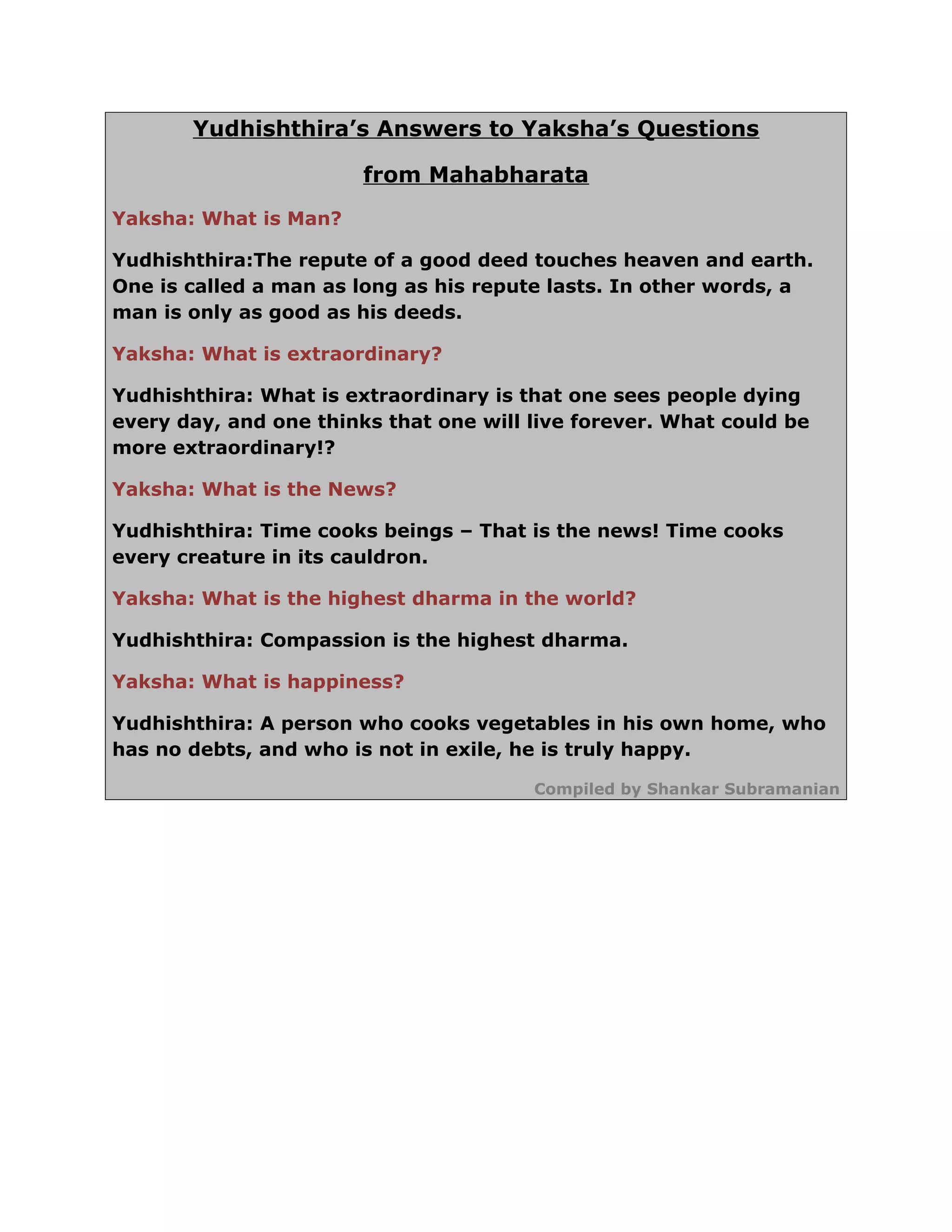Yudhishthira answers a series of questions from the Yaksha in the Mahabharata. He defines man as one whose good reputation lasts through their deeds. The most extraordinary thing is seeing people die daily yet feeling immortal. The greatest news is that time destroys all creatures. The highest dharma is compassion, and true happiness is found in cooking at home with no debts or exile.