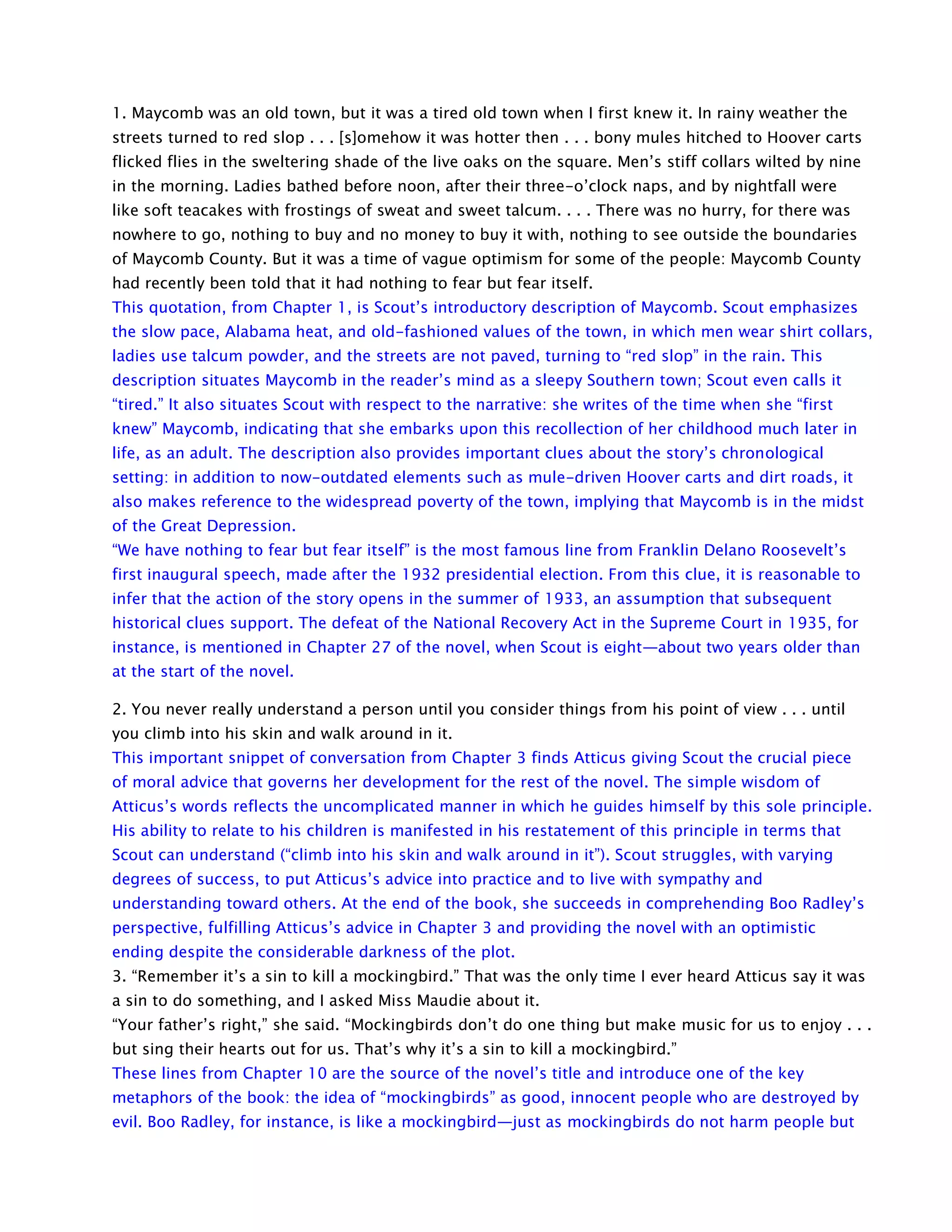 1. Scout provides an introduction to the sleepy southern town of Maycomb, Alabama in the 1930s. She describes the hot weather, old fashioned values, and poverty of the town.