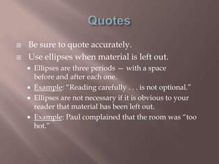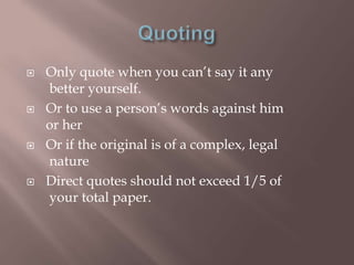 The document provides guidance on using quotes and paraphrasing in academic writing. It advises that quotes should be used sparingly and only when the original words cannot be improved upon. When quoting, accurate formatting is important including using ellipses for omitted text. Both quotes and paraphrasing require citations, and summaries should capture the essence while being much shorter than the original text.
