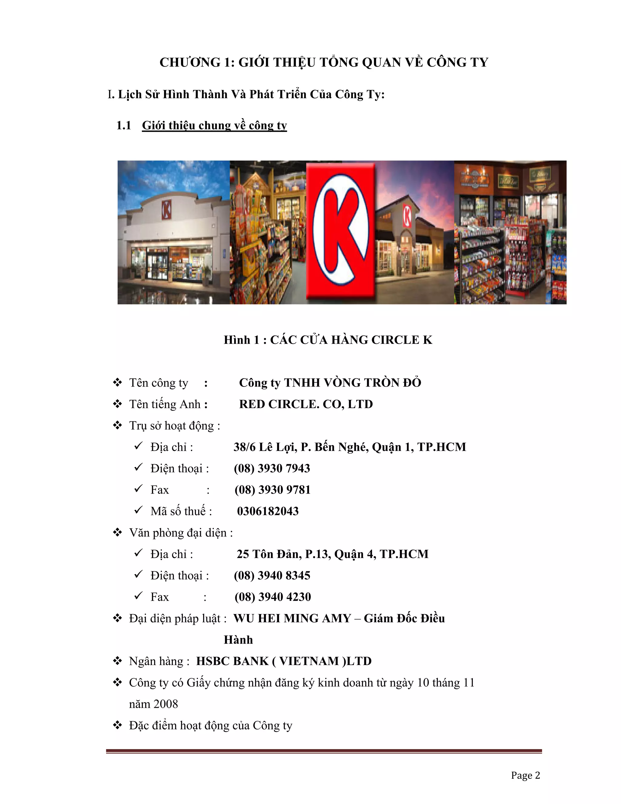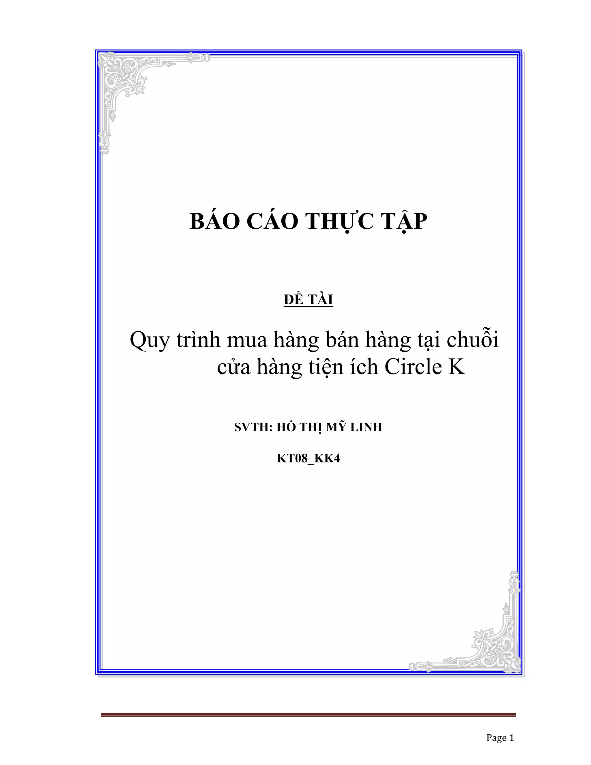 Tài liệu báo cáo thực tập về quy trình mua hàng bán hàng tại chuỗi cửa hàng tiện ích Circle K tại Việt Nam, cung cấp thông tin về lịch sử hình thành, đặc điểm hoạt động kinh doanh và cơ cấu tổ chức của công ty. Circle K, thuộc công ty TNHH Vòng Tròn Đỏ, là thương hiệu nổi tiếng với hơn 11.000 cửa hàng trên toàn cầu và hơn 5.000 cửa hàng ở châu Á. Khách hàng của Circle K bao gồm người tiêu dùng trong nước và quốc tế, với các sản phẩm đa dạng và dịch vụ tiện lợi.