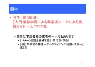 機械学習による異常検知- Rによる実 践ガイド -』, コロナ社 – 著者は下記書籍の訳者の一人でもあります • 『パターン認識と機械学習』 第12章(下巻) • 『統計的学習の基礎 ―データマイニング・推論・予測―』 第6章