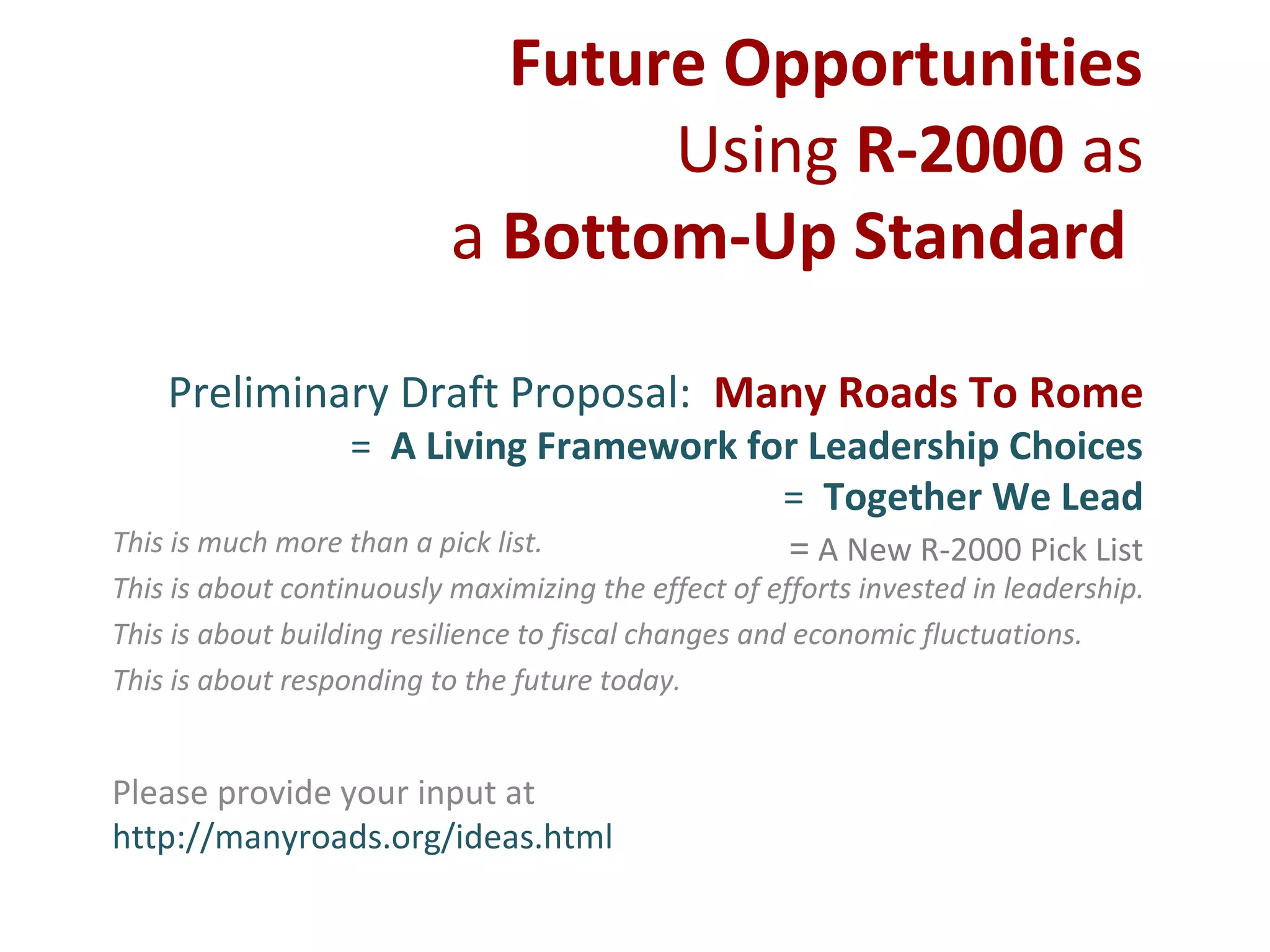 This document proposes a new methodology called "Many Roads to Rome" to continually update the R-2000 residential construction standard. The methodology is designed around a "Pick List" that provides builders flexibility to choose leadership focuses in areas like health, economy, and resilience. Builders would complete a minimum of one "Pick" from List A or five from List B. Picks would be recorded online and the standard would self-update based on collective experience. The goal is for R-2000 to remain commercially viable and leading edge in each market through collaborative leadership and local capacity building. Input is sought on developing the Pick List and implementation plan.