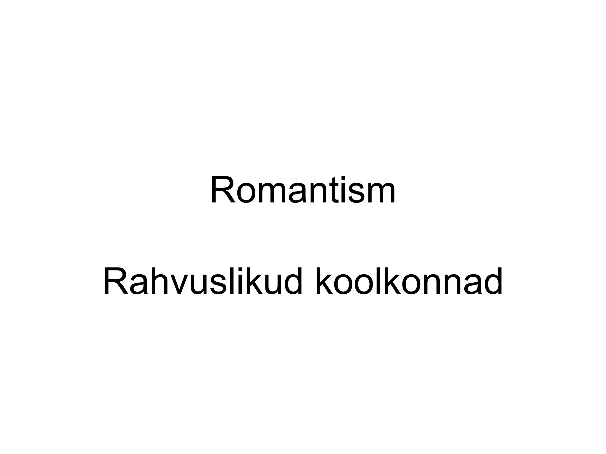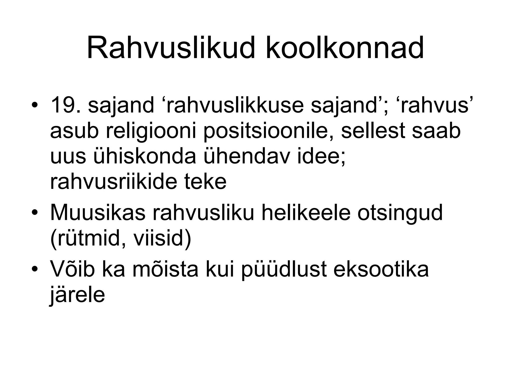 Rahvuslikud koolkonnad 19.sajand ‘rahvuslikkuse sajand’; ‘rahvus’ asub religiooni positsioonile, sellest saab uus ühiskonda ühendav idee; rahvusriikide teke Muusikas rahvusliku helikeele otsingud (rütmid, viisid) Võib ka mõista kui püüdlust eksootika järele