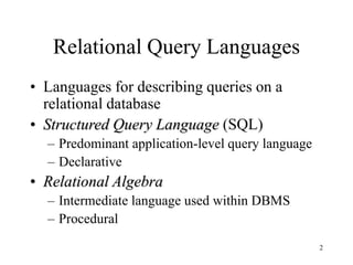 This document provides an overview of relational algebra and SQL. It discusses key concepts such as relational query languages, relational algebra operators like selection, projection, join, and division. It also covers how SQL corresponds to relational algebra, with SQL using a declarative syntax while relational algebra is procedural. Common queries involving joins, aggregates, and other features are demonstrated in both SQL and equivalent relational algebra expressions.