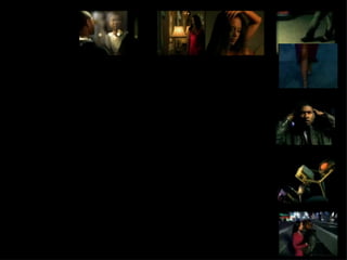 The document analyzes several R&B music videos to understand common conventions in the genre. It summarizes 5 videos analyzed in depth, highlighting traits like close-ups of the artist singing to the camera; bare, light-filled sets focusing attention on the artist; and intimate scenes between artists and lovers with motifs like light or water. Common traits across the analyzed R&B videos include portraying artists in wealthy, lavish settings and using close-ups, lighting, and camerawork to portray intimacy and draw focus to the artist.