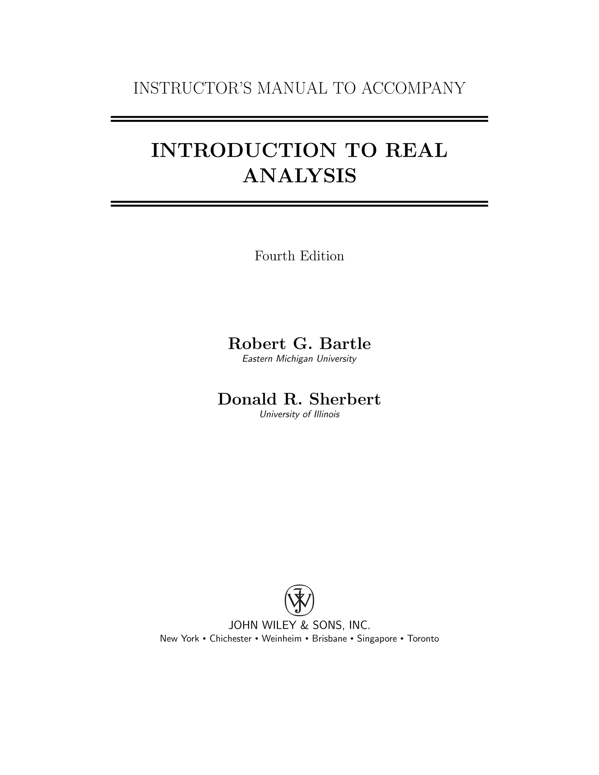 This document is an instructor's manual for an introduction to real analysis textbook. It provides partial solutions to exercises in the textbook to help instructors teach from it. The preface explains that the manual shares the authors' experiences teaching from earlier editions and aims to provide enough guidance for instructors to find complete solutions. It also includes helpful graphs. The manual will aid instructors in using the analysis textbook and understanding how to work through its problems.