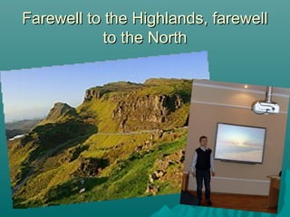 This poem expresses nostalgia and love for the Scottish Highlands. The speaker bids farewell to the mountains, forests, and rivers of the Highlands, yet their heart remains there. Wherever the speaker goes, their heart stays in the Highlands, longing to chase deer and roe among the wild places they cherish.