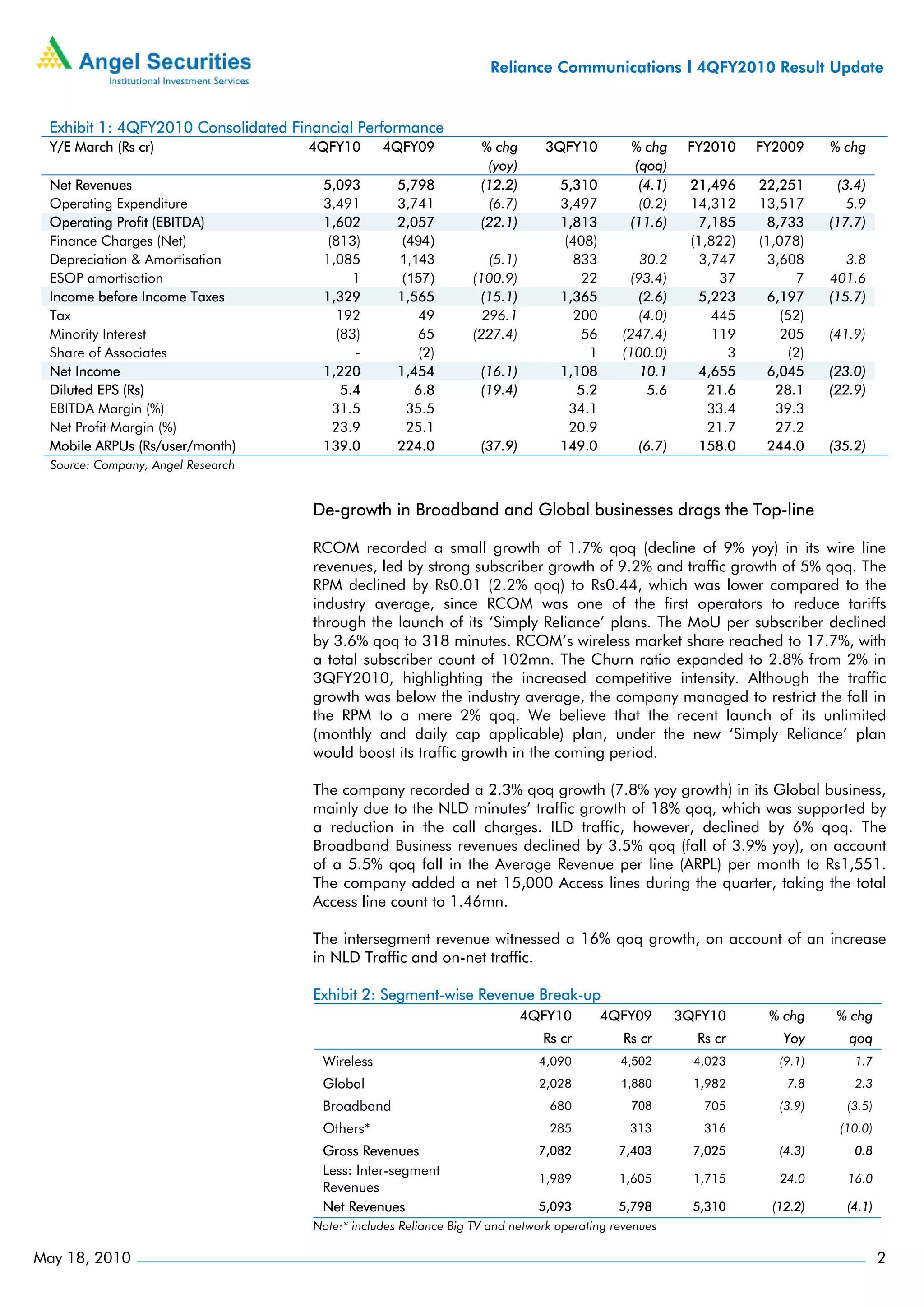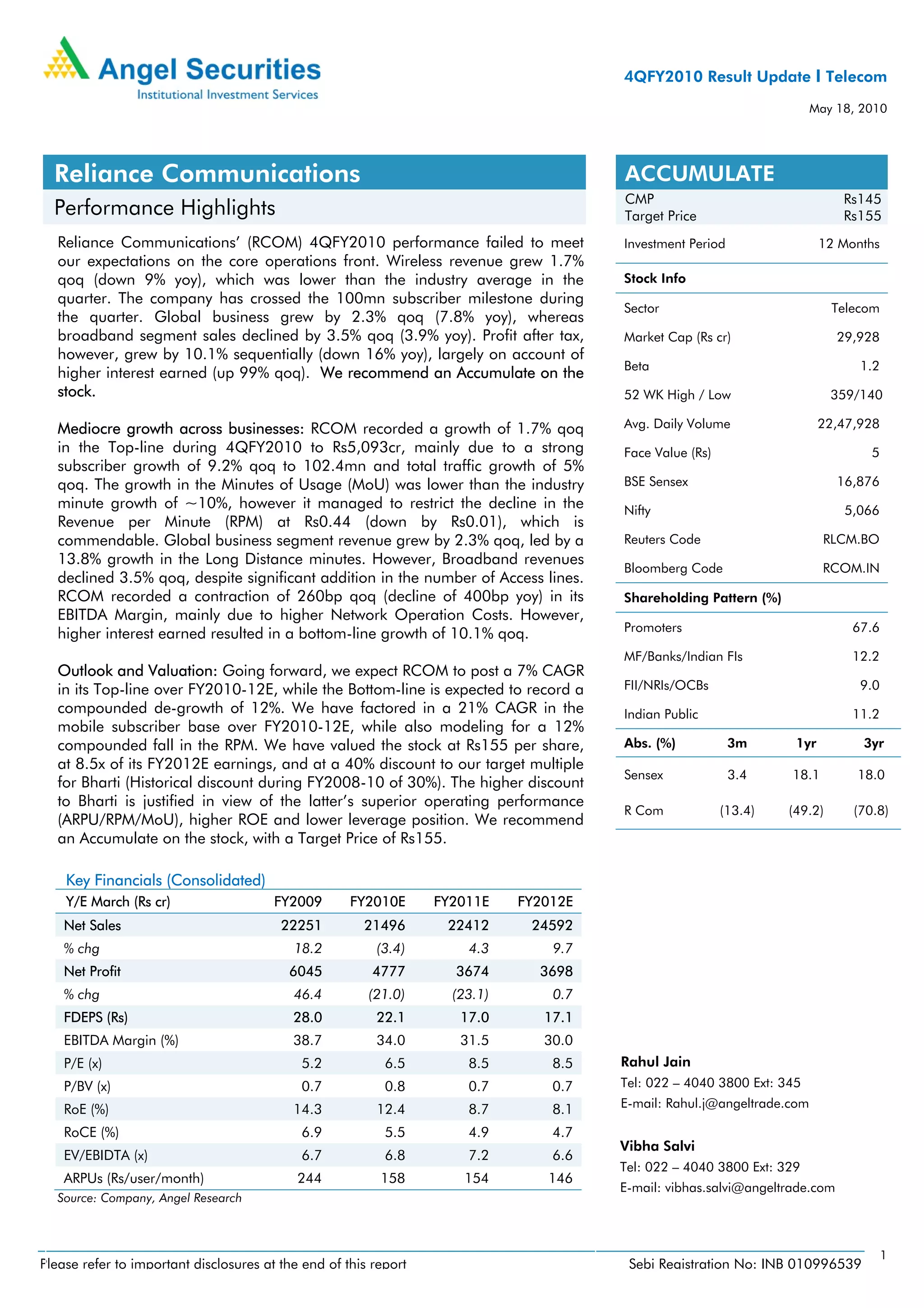 Reliance Communication's quarterly performance failed to meet expectations, with wireless revenue growing only 1.7% compared to the industry average. While the company surpassed 100 million subscribers, its broadband and global business segments saw declines. Profits grew 10.1% due to higher interest earned, but margins fell due to higher network and access costs. Going forward, profitability is expected to come under pressure from increased leverage for capex spending and acquiring 3G licenses.