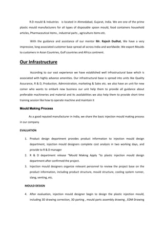 R.D Mould & Industries, established in 1999, is a reputable plastic mould manufacturer based in Ahmedabad, India, specializing in various mould types, including disposable items and industrial parts. The company prides itself on its quality infrastructure, skilled workforce, and commitment to timely delivery and customer service, offering customization and after-sale support. With a vision to be a leading customer-centric organization, R.D Mould & Industries aims to provide comprehensive solutions for mould and die requirements while ensuring cost-effectiveness and client satisfaction.