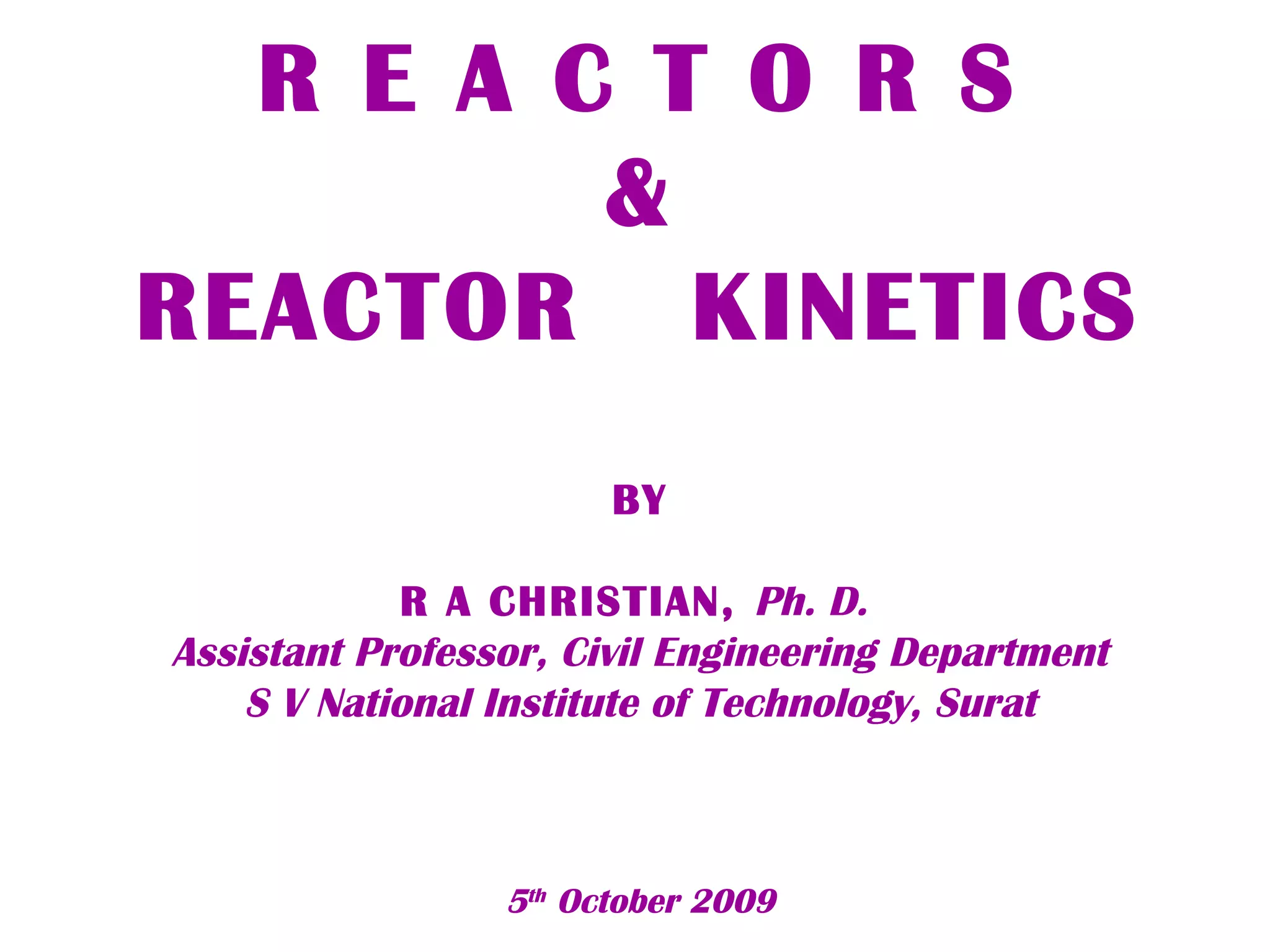 This document provides an overview of different types of reactors used in wastewater treatment processes. It defines reactors as vessels that hold wastewater for treatment and describes common reactor shapes. It then classifies and describes several reactor types including continuously stirred tank reactors, plug flow reactors, completely mixed batch reactors, fluidized bed reactors, packed bed reactors, and sequencing batch reactors. For each reactor type, diagrams are provided and equations are derived for hydraulic retention time and effluent concentrations based on reaction kinetics. Examples are also included to illustrate reactor sizing calculations.