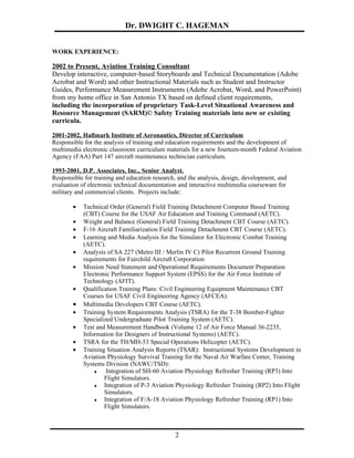 This document provides biographical information on Dr. Dwight C. Hageman, including his education, licenses, security clearance, work experience, military honors and awards, and selected publications. Dr. Hageman has over 30 years of experience in human factors research, instructional system design, and aircrew training. He has a doctorate in vocational and technical education and has held various roles developing training programs and materials for the military and commercial aviation.