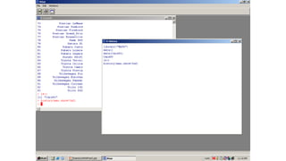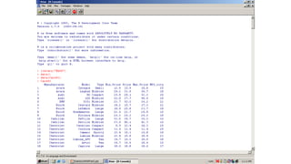 R is a free programming language and software environment for statistical analysis and graphics. It contains functions for data manipulation, calculation, and graphical displays. Some key features of R include being free, running on multiple platforms, and having extensive statistical and graphical capabilities. Common object types in R include vectors, matrices, data frames, and lists. R also has packages that add additional functions.