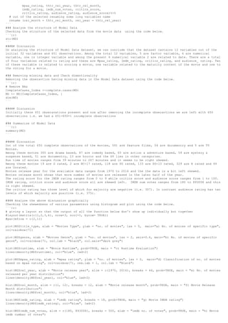 The document discusses analyzing a movie dataset to understand predictors of audience score. It loads necessary packages and the movie data. Exploratory data analysis is performed, including checking data structure, selecting relevant variables for modeling, removing missing data, summarizing variables, and graphically analyzing relationships. Runtime is found to have a weak positive linear relationship with audience score based on a scatterplot, while release year and month show no clear relationships. Correlation analysis will further examine relationships between predictors and the response variable, audience score.