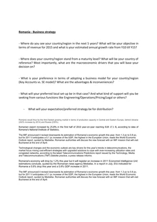 Romania's economy is expected to grow at an annual rate of 5.1% from 2010 to 2015, with an objective of increasing revenue in 2015. Romania's economy is currently maturing and it will use countries like Ukraine and Russia as references for its development. Key macroeconomic drivers that Romania will consider include export growth and technological changes. Romania will likely adopt a key accounts business model and seek support from functions like engineering, operations, and pricing to establish local infrastructure and distribution strategies.
