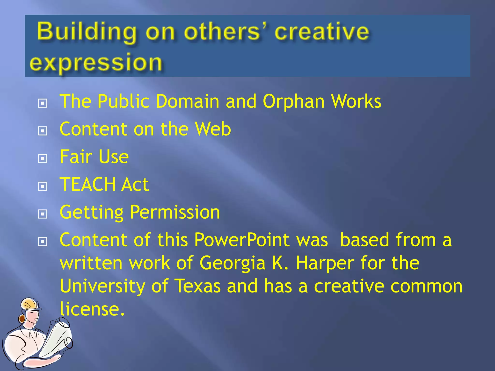 This document provides an overview of copyright and fair use guidelines for using content from others in educational settings. It discusses identifying orphan works and works in the public domain, implied and express licenses including Creative Commons, factors for determining fair use, and expanded rights for educators under the TEACH Act. Resources for obtaining permission are provided, such as the Copyright Clearance Center, as well as guidance on documenting permission and dealing with unidentifiable copyright owners.