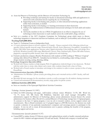 Robin Peralta has over 23 years of experience in education and technology integration. She is passionate about teaching students and teachers how to use technology creatively and effectively in the classroom. Her background includes roles as a Laptop Program Director, Technology Integration Specialist, and Telecommunications Specialist. She is currently pursuing a PhD in psychology with a focus on integrating technology, learning, and psychology.