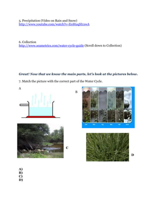 The document outlines a lesson plan on the water cycle for 4th grade students. It includes 12 questions to guide students through understanding the main components of the water cycle, including evaporation, condensation, precipitation, and collection. Students are directed to various websites to learn about each part and take a short quiz to test their understanding. The goal is for students to grasp the full water cycle and how water is recycled through nature.