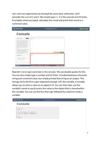 The document discusses the basics of R, including its history, advantages, and disadvantages. It describes the R console as the main interface where commands are executed. Key concepts covered include variables for storing values, the workspace for accumulating defined variables, and performing basic arithmetic and assignments. The document also introduces basic data types in R like logicals, numerics, integers, characters, and how to determine the class of each. Vectors and matrices are discussed as the main data structures, including how to create, name, and perform operations on them element-wise.