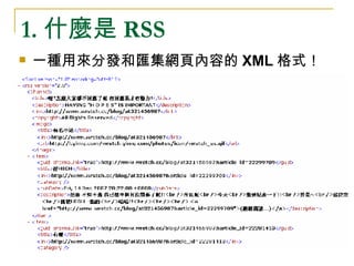 本文件介绍了RSS的定义及其优点,如实时更新和快速浏览网页内容。文档提供了使用RSS的指南,包括RSS阅读器和订阅方法,并强调RSS在信息传递中的重要性。最后,展望了未来人们在移动设备上获取和分享信息的趋势。