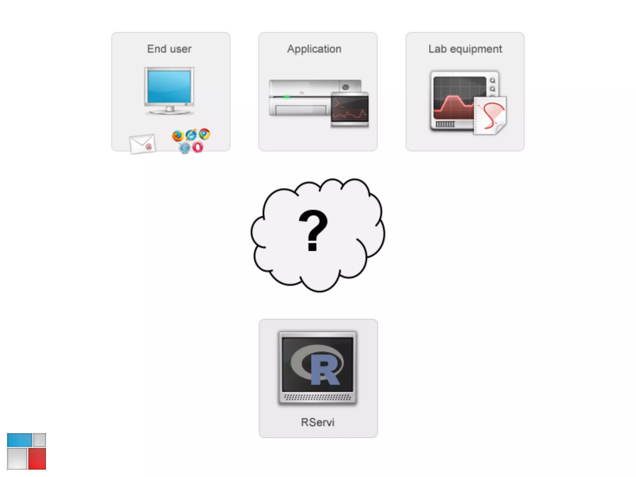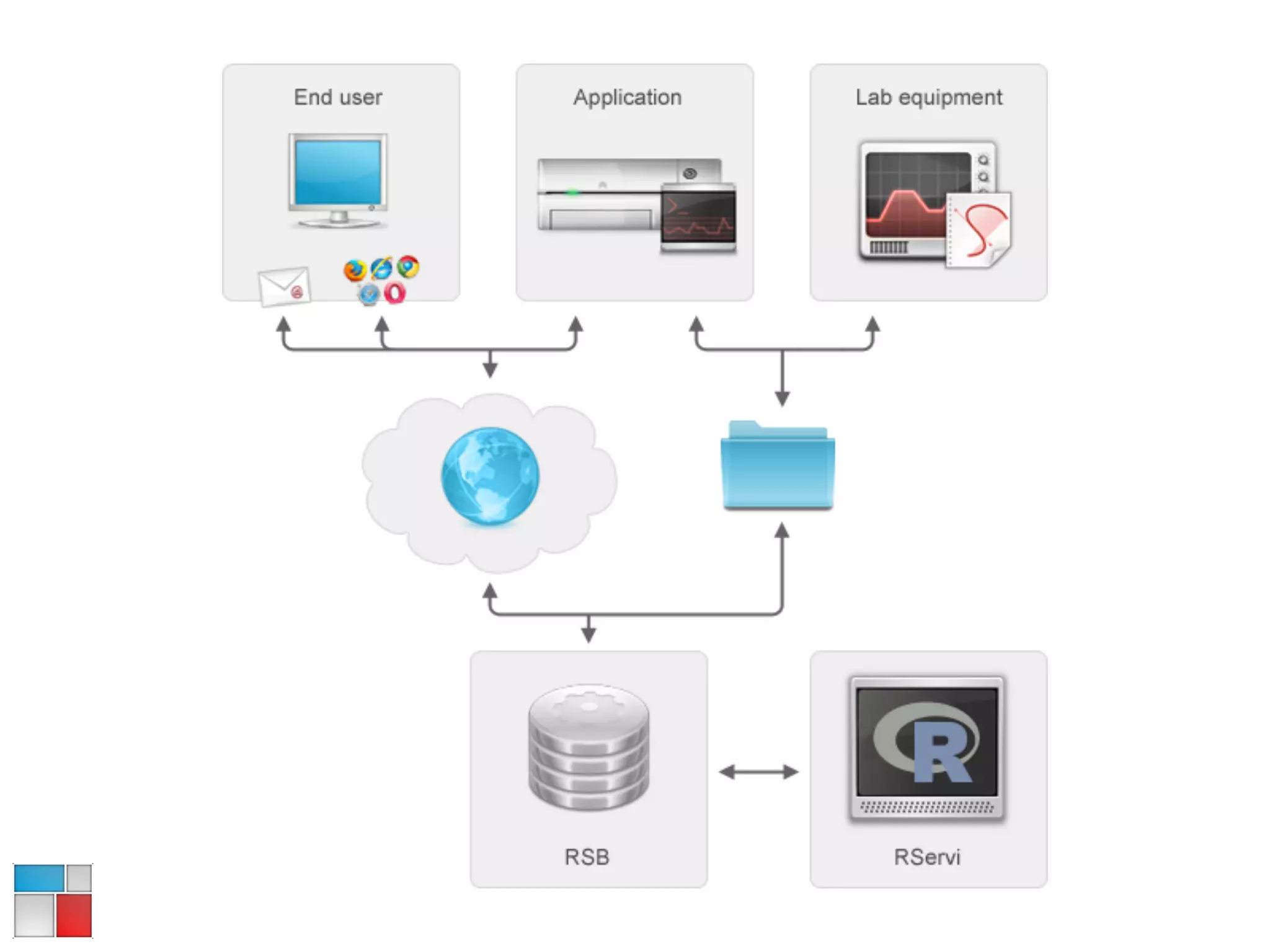 The R Service Bus (RSB) allows R to be plugged into various software workflows independently of the technologies used. It provides a RESTful and SOAP API to integrate R scripts and Sweave files into machine-to-machine and human workflows. RSB is asynchronous at its core and can handle slow, repetitive, or big data jobs. It is used in production in pharmaceutical, biotechnology, and finance companies. RSB is open source and released as a WAR file and Tomcat bundle to run on Java/Spring platforms.