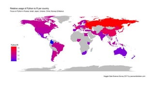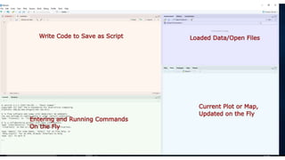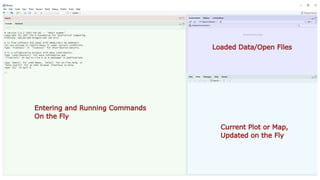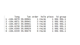 This document discusses using R for spatial and geospatial analysis. It provides an overview of key R packages for working with spatial data like ggplot2, rgdal, and maptools. It also demonstrates how to create basic maps from shapefiles, perform spatial joins to add data attributes, and generate choropleth and heat maps for visualization and analysis. The document serves as a tutorial for getting started with spatial analysis and visualization using open-source R tools and libraries.