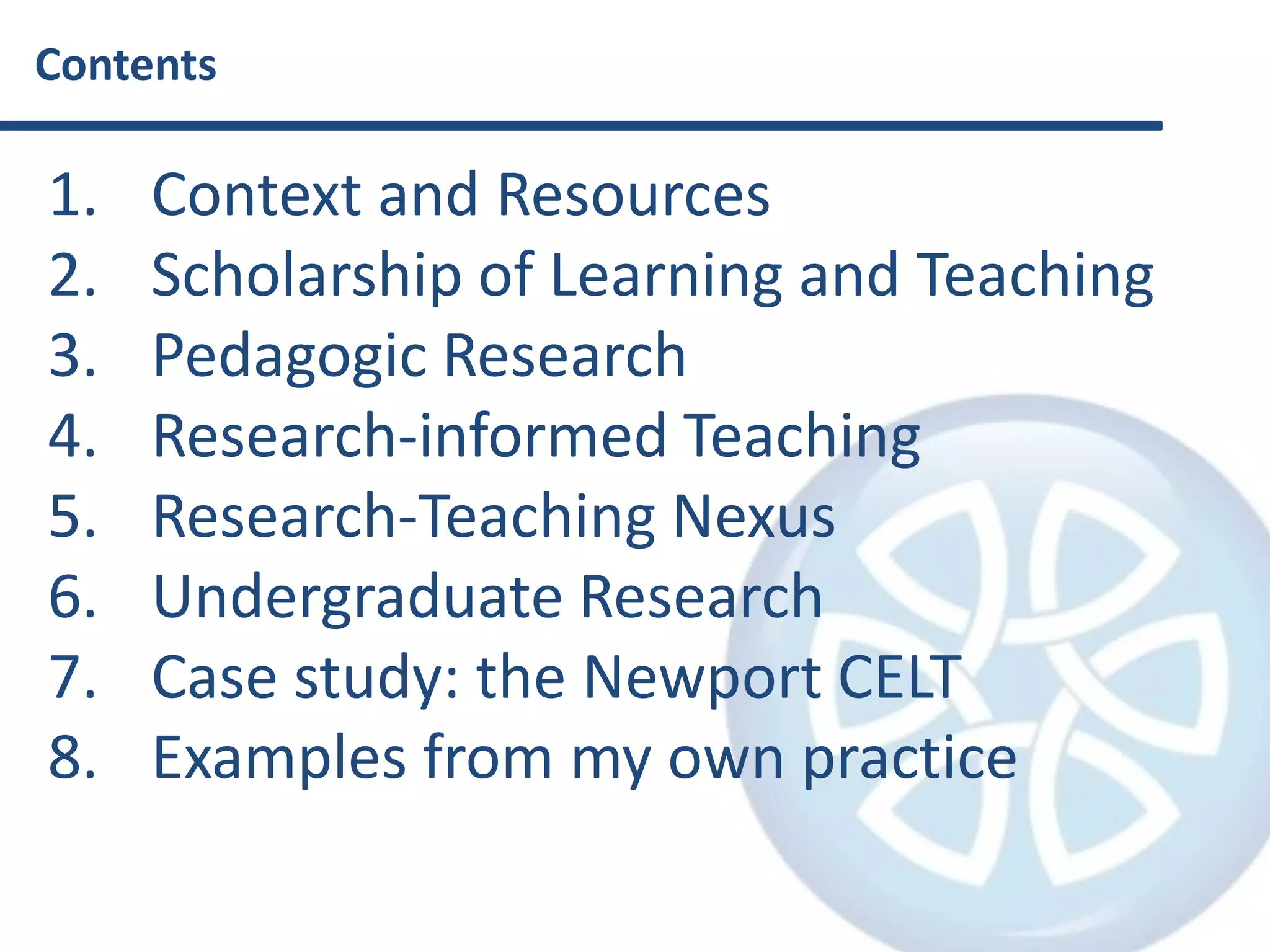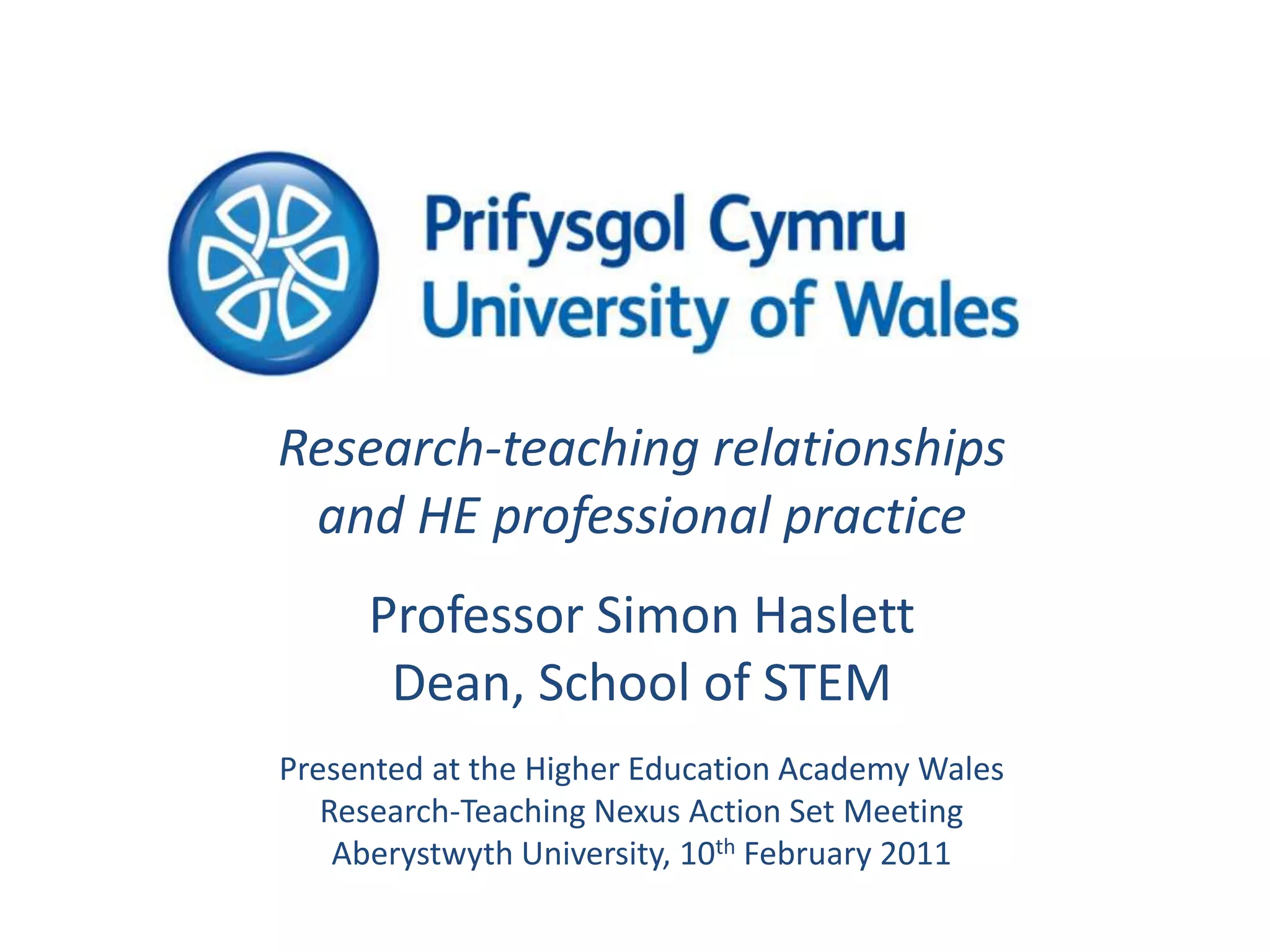 The document discusses the integration of research and teaching in higher education, focusing on the Higher Education Academy Wales' initiatives to strengthen the research-teaching nexus. It presents various strategies, including the establishment of research clusters and encouraging staff participation in pedagogic research, alongside case studies showcasing effective practices. Additionally, it highlights the importance of curriculum evaluation to ensure alignment with recent research and scholarship.