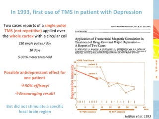 The talk proposes using an historical perspective to discuss transcranial magnetic stimulation (TMS) for treating major depressive episodes. It outlines 3 historical steps: (1) 18th century electrical brain stimulation experiments in psychiatry, (2) late 20th century validation of repetitive TMS as focal brain stimulation, and (3) using 21st century neuroimaging-guided TMS to better target stimulation and account for neuroanatomical variability between patients. MRI-guided TMS has shown better outcomes than conventional 5cm localization methods alone. Future directions include optimizing individualized "electrical brain interaction" through real-time neuroimaging.
