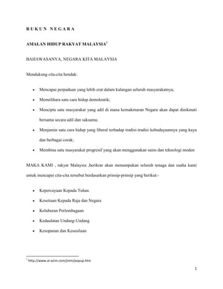Rukun Negara menetapkan lima prinsip untuk mencapai perpaduan nasional dan membentuk masyarakat Malaysia yang bersatu padu meliputi kepercayaan kepada Tuhan, kesetiaan kepada raja dan negara, keluhuran perlembagaan, kedaulatan undang-undang, dan kesopanan serta kesusilaan.