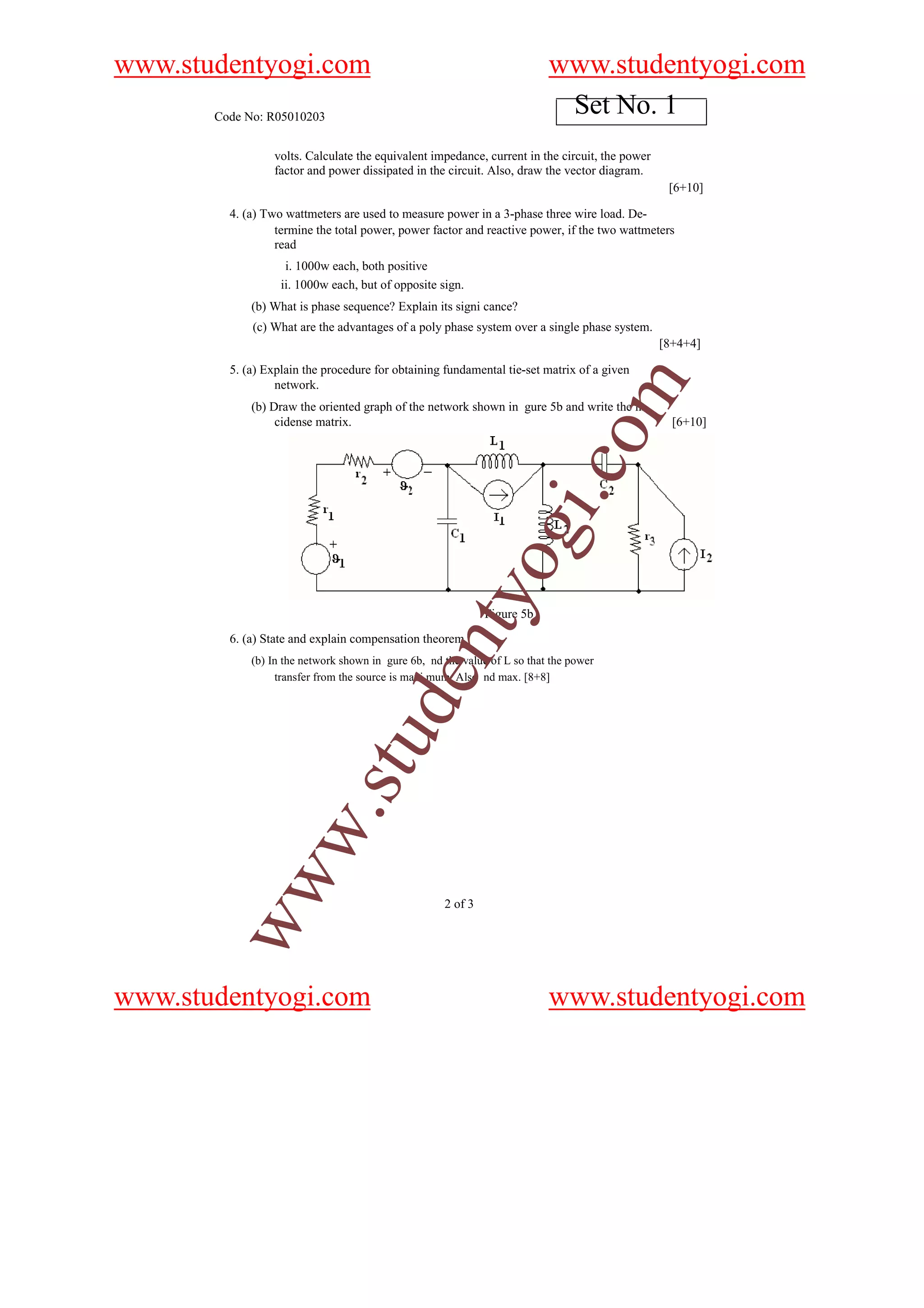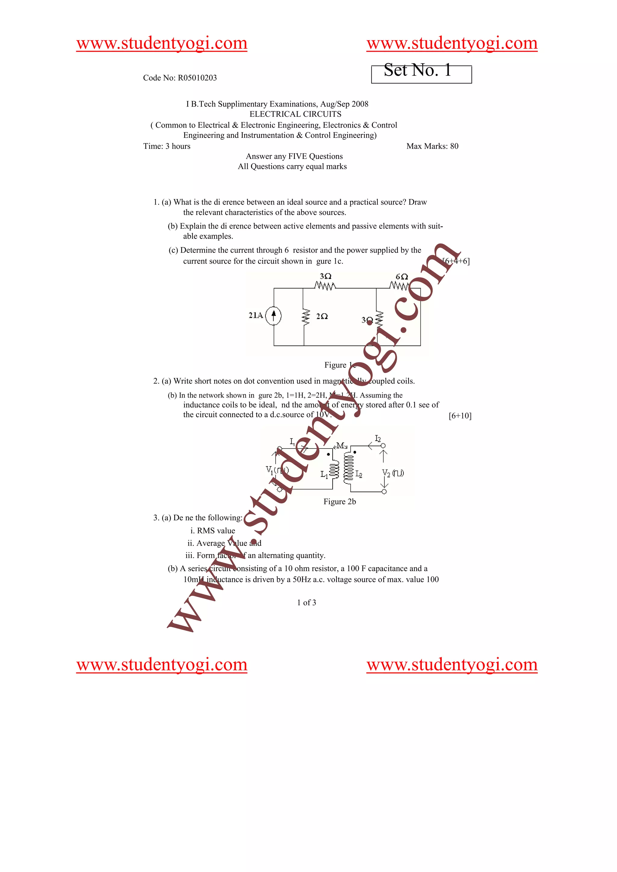 This document contains an examination for an Electrical Circuits course. It consists of 8 questions covering various topics in electrical circuits, including ideal and practical sources, active and passive elements, network analysis techniques like source transformations, and three-phase systems. Students are required to answer any 5 of the 8 questions in the allotted 3 hours.