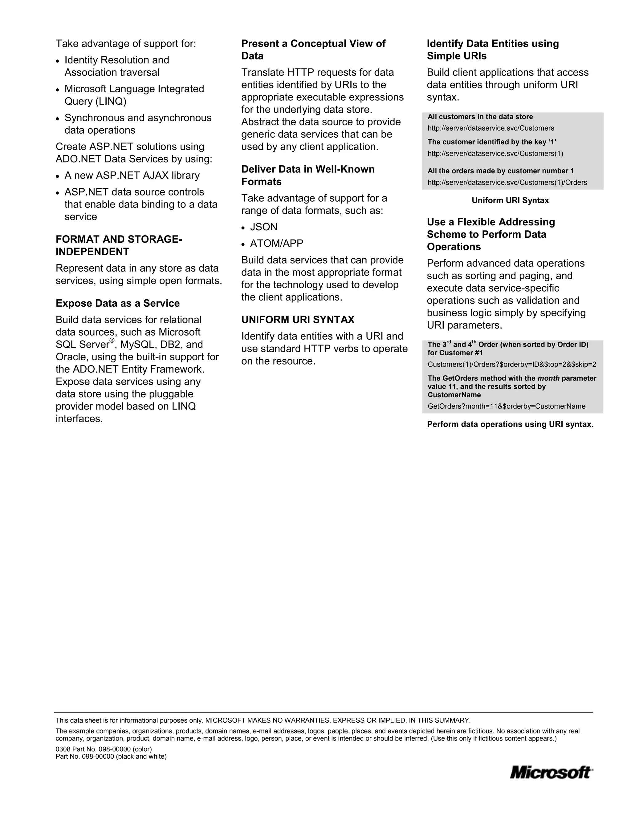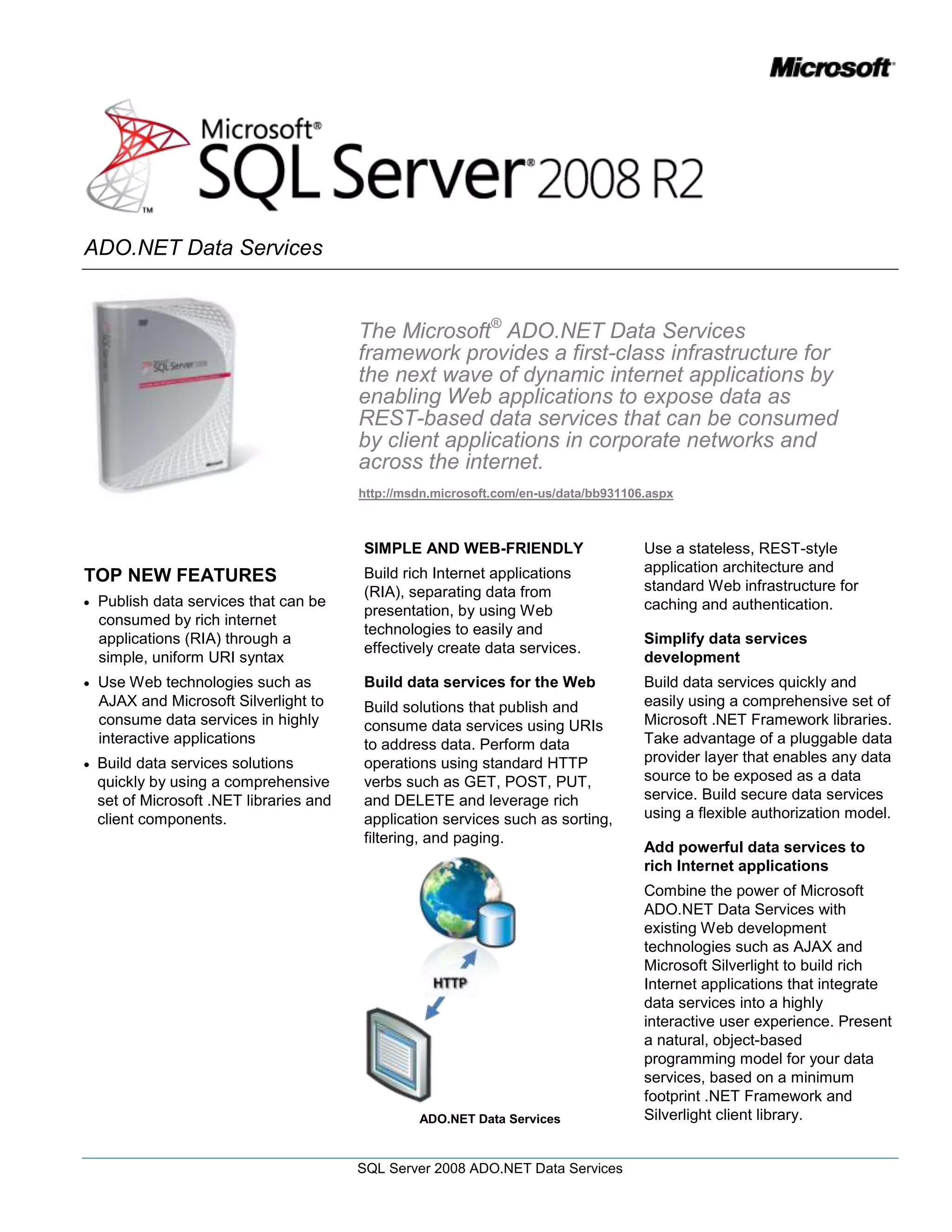 Microsoft ADO.NET Data Services enables the creation of REST-based data services that can expose data from any source and be consumed by rich internet applications. It provides libraries and client components to quickly build data services that present data using a uniform URI syntax and standard HTTP operations. These data services can then power interactive experiences when combined with technologies like AJAX and Silverlight.