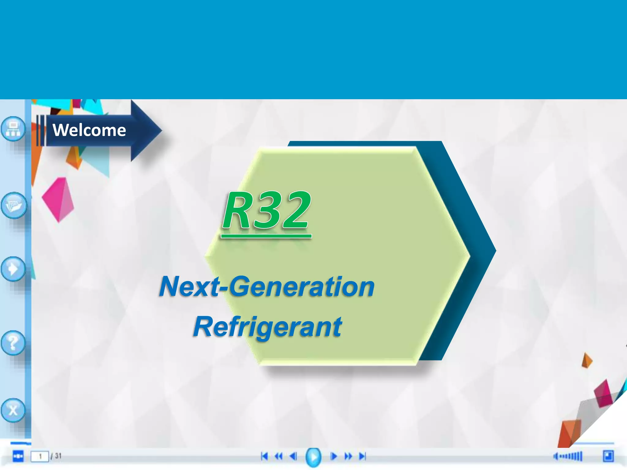 This document discusses next-generation refrigerants and focuses on R32. It begins by listing the objectives and discussing refrigerants in general and their effects on the environment. Specifically, it covers ozone depletion and global warming. R32 is then introduced as a solution and its features and benefits are described. The document evaluates R32's physical and chemical properties and regulations around refrigerants. It includes assessments to test the reader's understanding.
