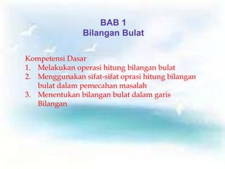 Dokumen ini membahas tentang bilangan bulat, termasuk pengertian, jenis, serta sifat-sifat operasinya. Terdapat penjelasan mengenai bilangan cacah, genap, ganjil, dan bilangan prima, serta cara membandingkan dan melakukan operasi hitung pada bilangan bulat. Penjelasan juga mencakup perpangkatan, akar kuadrat, dan penerapan sifat komutatif dalam operasi hitung.