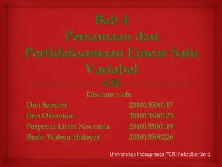 Dokumen tersebut merupakan modul pelajaran matematika tentang persamaan dan pertidaksamaan linear satu variabel yang mencakup pengertian, penyelesaian, dan contoh soal penerapannya. Modul ini disusun oleh 4 mahasiswa Universitas Indraprasta PGRI untuk mata kuliah matematika pada tahun 2012.