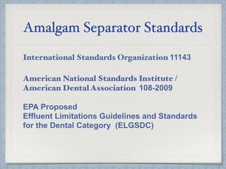 2) International and American standards require amalgam separators to remove at least 95% of solids. The EPA proposes requiring 99% removal. Separators must be maintained and inspected regularly to ensure proper functioning.