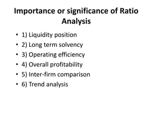 Ratio analysis is used to interpret financial statements and determine a firm's strengths, weaknesses, historical performance, and current condition. Key ratios measure liquidity, profitability, asset turnover, and solvency. Liquidity ratios like current and quick ratios assess short-term financial health. Profitability ratios like gross profit, operating, and net profit margins evaluate earnings. Turnover ratios like inventory and accounts receivable examine asset use efficiency. Solvency ratios such as debt-to-equity assess long-term financial stability. Ratio analysis provides insight into a business, but has limitations like difficulty in comparisons and impact of inflation.