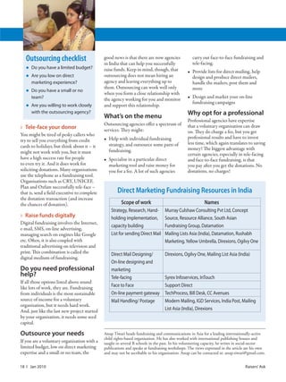 Individuals provide the majority of donations to non-profits, accounting for over 80% of contributions in developed countries like the US and UK. In India, individuals donate up to 90% to organizations like CRY, GiveIndia, and HelpAge. The document discusses various direct marketing tools that non-profits can use to solicit donations from individuals, such as face-to-face fundraising, direct mail, telephone fundraising, and digital fundraising using the internet and mobile phones. It also notes that while labor-intensive, individual fundraising is the most sustainable source of funding. Professional fundraising agencies can help non-profits implement these tools successfully through outsourcing.