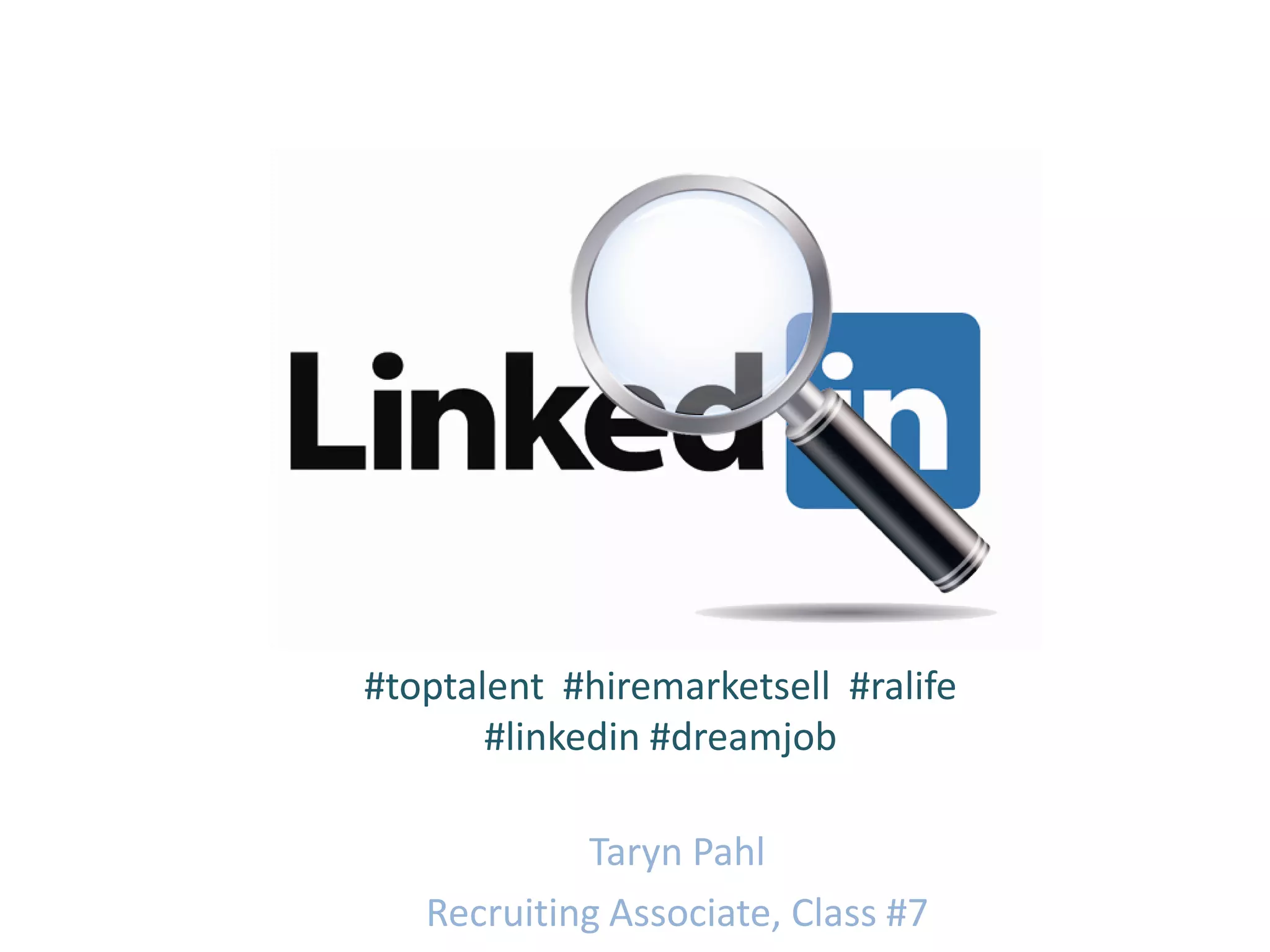 The document provides guidance for a new recruiting associate at their first month on the job. It recommends networking on LinkedIn, asking questions of more experienced recruiters, learning about the positions being recruited for and candidate objections. It also suggests getting familiar with tools like LinkedIn Recruiter through exploring filters, searches and analytics. Sourcing candidates involves searching strategically using keywords and Boolean strings, as well as leveraging top companies and schools depending on the role. Understanding LinkedIn's own culture is also important for representing the company to candidates.